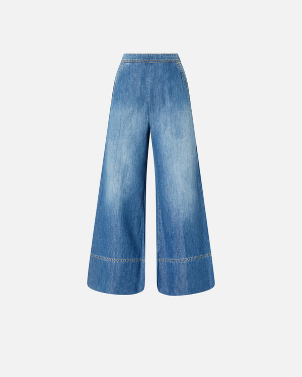 Jeans dalla silhouette a palazzo realizzati in leggero denim di misto cotone e lino dal lavaggio medio scuro. Questo particolare modello è caratterizzato da una gamba molto ampia, con una leggera svasatura al fondo che ne amplifica la linea a palazzo, ed è perfetto per la stagione estiva grazie anche alla leggerezza del tessuto. La silhouette con tasche alla francese sui fianchi e nessuna chiusura rende i jeans semplici da indossare e personalizzare, con camicie o giubbini in denim per un total look d'impatto.