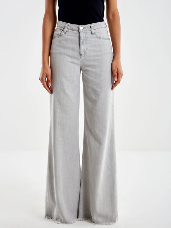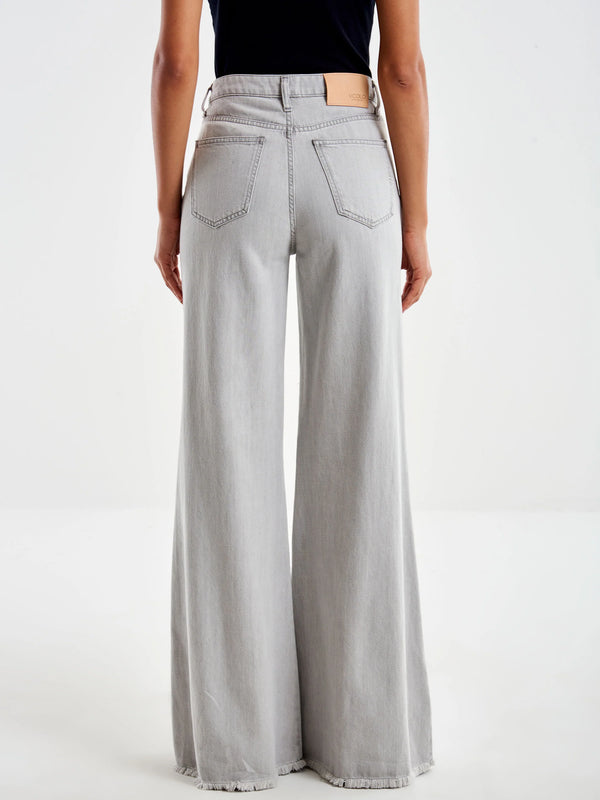 Jeans a palazzo ampio con vita alta e passante. Gamba lunga. Con tasche anteriori e posteriori. Chiusura frontale con cerniera e bottone. Fondo sfrangiato. Denim grigio.