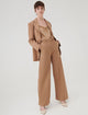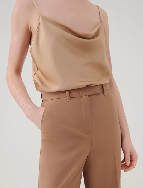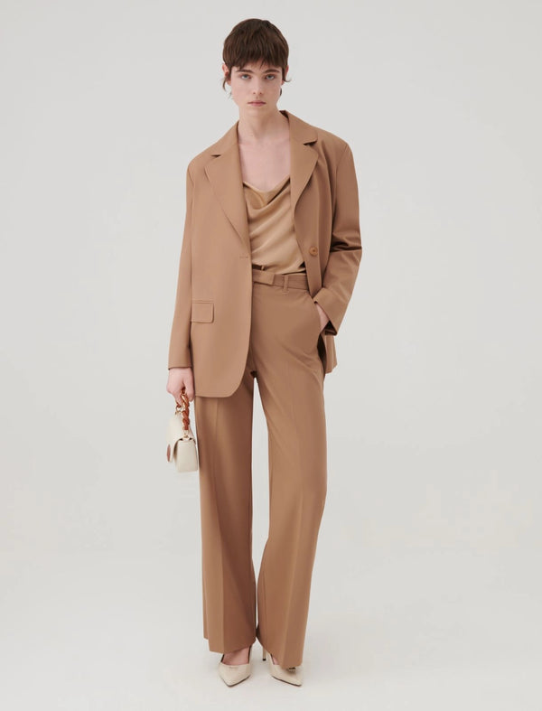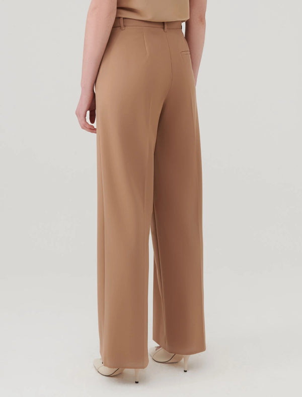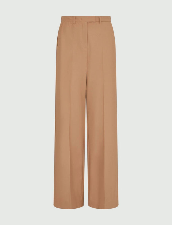 Pantaloni leggermente stretch wide leg. Chiusura con gancio e zip nascosti, tasche alla francese davanti, singola a filetto dietro. Piega stirata fronte e retro.