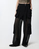 Pantaloni cargo da donna realizzati in tessuto georgette semitrasparente, foderato nella parte superiore. I pantaloni si caratterizzano per una vestibilità slouchy, oversize e rilassata, enfatizzata dalle maxi tasche applicate su entrambi i lati, sia sui fianchi che a metà gamba. La vita dal fit rilassato è costruita con dettagli punto smock, coulisse elastica inserita visibile sul retro, che permette di regolarne la vestibilità, e piccola patta con bottoni che ne completa la chiusura. I pantaloni cargo effetto trasparente sono la perfetta combinazione di uno stile urban e femminilità assoluta.