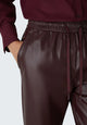 Pantaloni in materiale sintetico, linea jogging. Vita elastica con coulisse, tasche alla francese davanti, a filetto dietro.Tessuto a maglia 100% poliestere; spalmatura resina poliuretanica.
