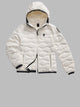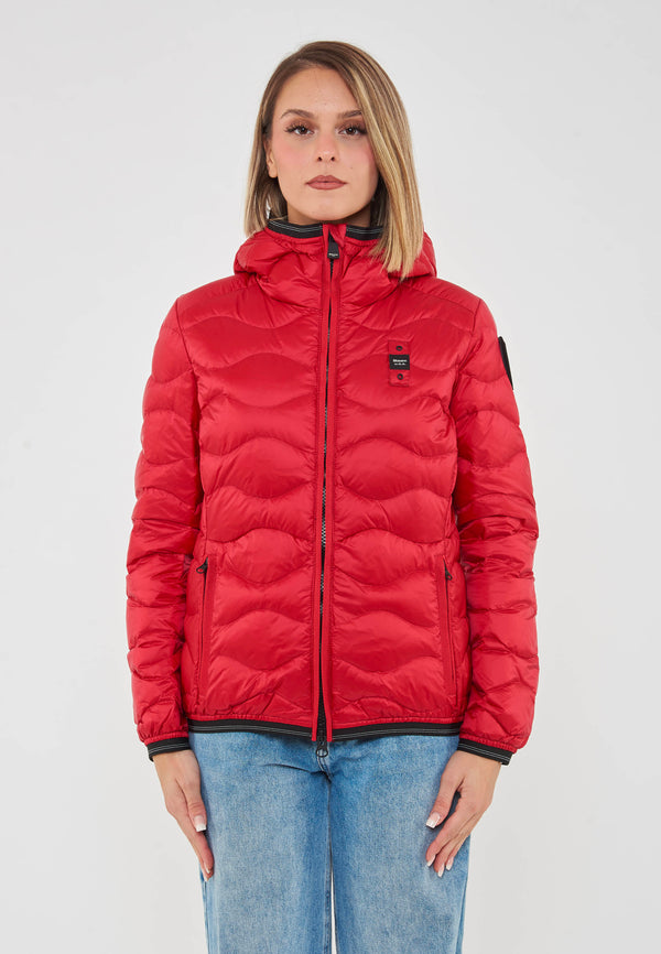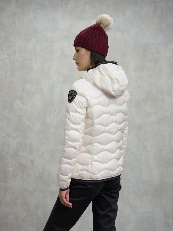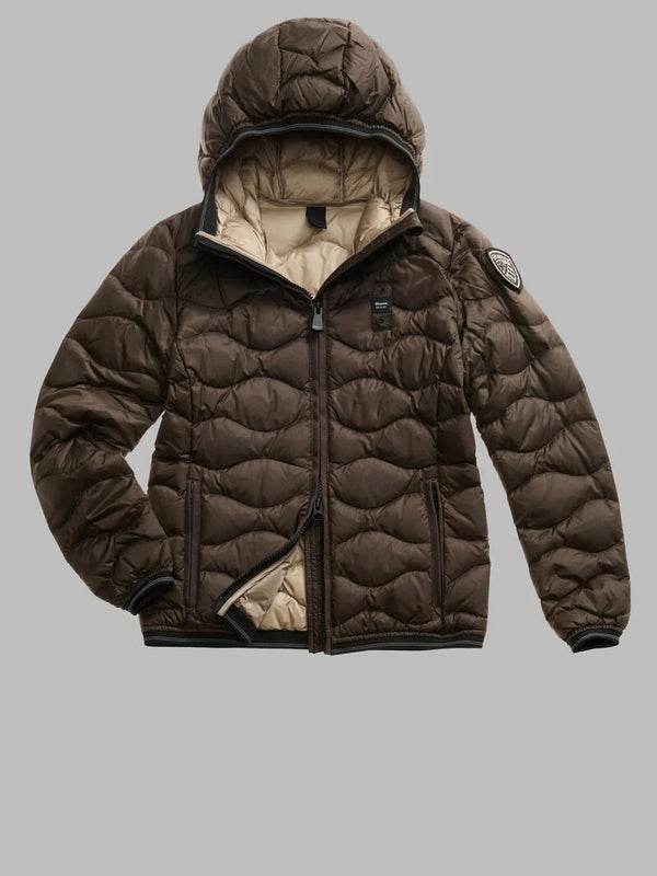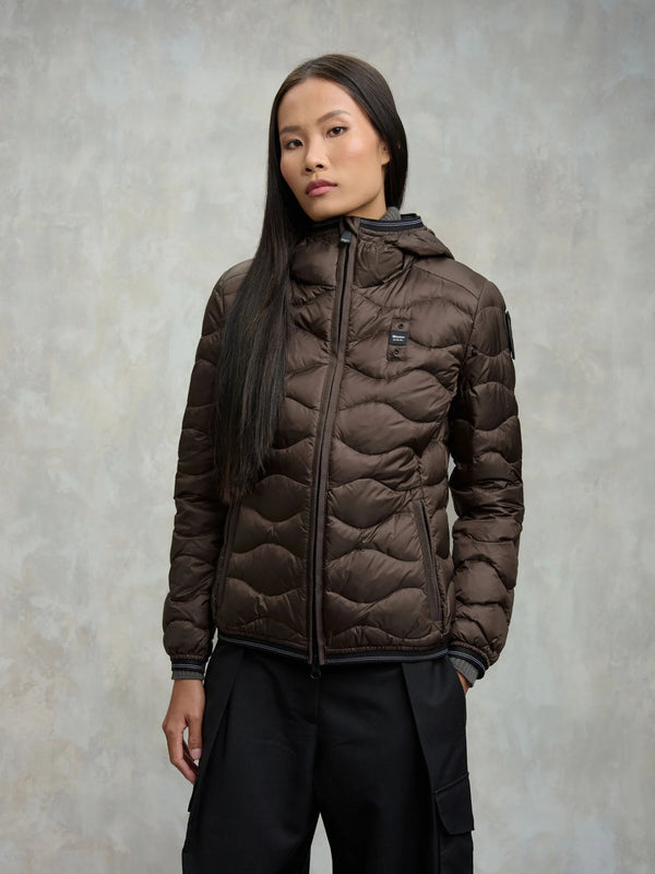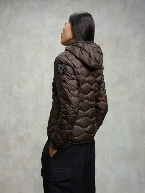 Piumino idrorepellente trapuntato ad onde orizzontali dal taglio svasato. Capo iconico Blauer con imbottitura naturale, calda e non ingombrante.
