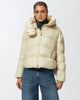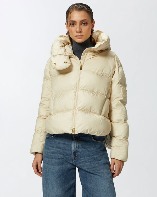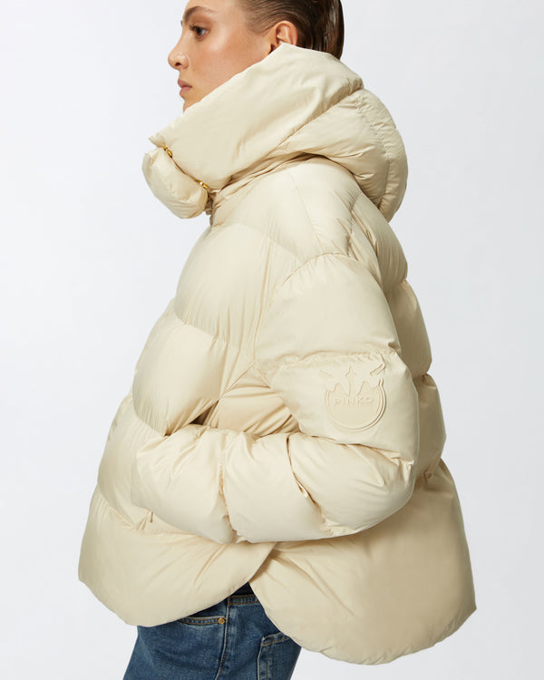 Piumino corto trapuntato con imbottitura sintetica, realizzato in tela tecnica. Il collo alto è particolarmente avvolgente, ed è chiuso con doppio bottone laterale. Una delle due maniche è personalizzata con patch gommato con logo Love Birds. Tasche oblique sui fianchi, chiuse con zip invisibile e chiusura con zip metallica a doppio cursore.