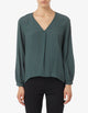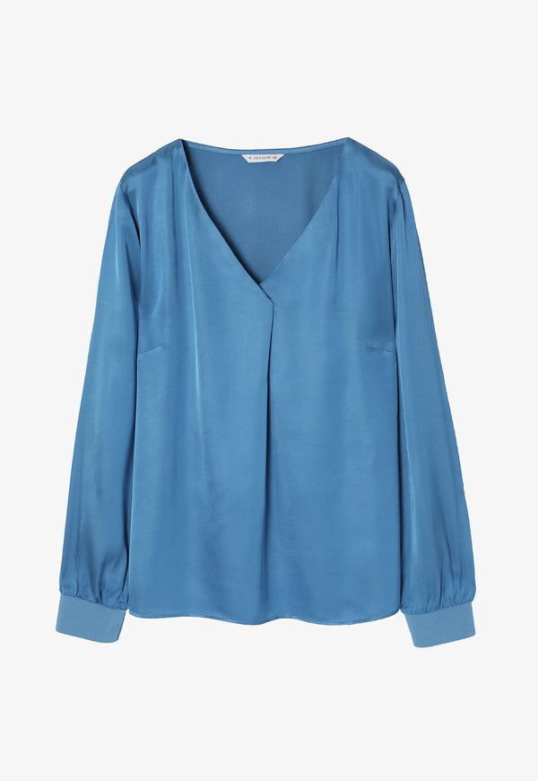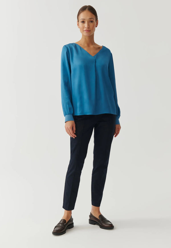 Blusa in crêpe de Chine misto seta dalla linea morbida con piega sul davanti. Scollo a V con maniche lunghe leggermente ampie. Fondo retro più lungo. Lunghezza 64 cm.