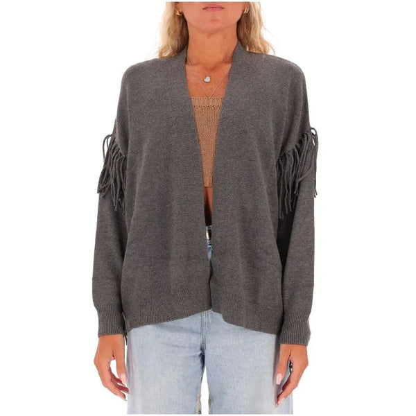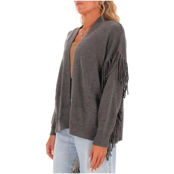 Cardigan lungo in maglia misto viscosa dalla linea over con dettaglio di frange in maglia applicate. Collo a scialle, maniche lunghe con giro sceso e polsino. Senza chiusura.