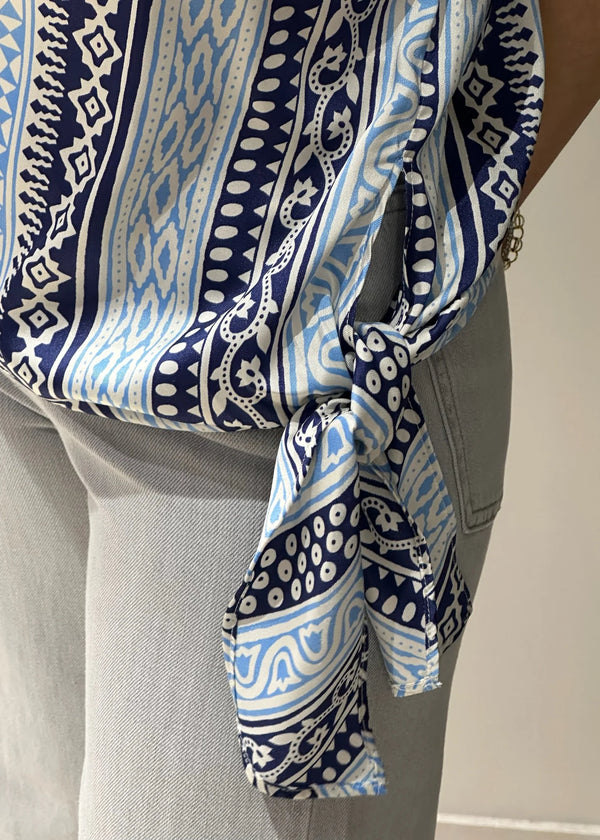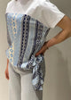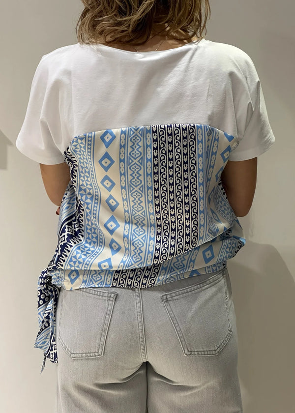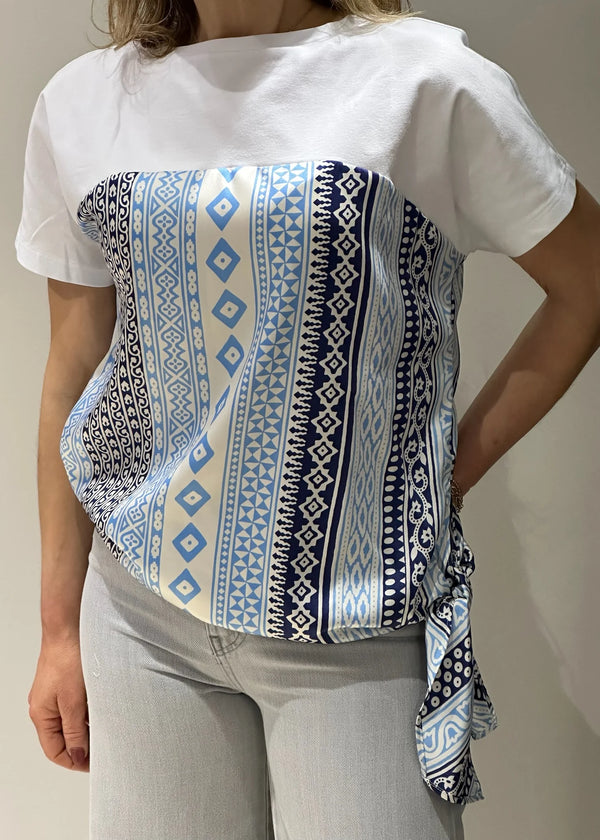 Blusa con parte alta in jersey di cotone stretch e parte bassa in twill tecnico. Scollo stondato. Maniche corte. Modello con carré sia sul davanti che sul retro. Nodo sul fianco sinistro