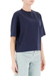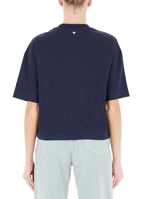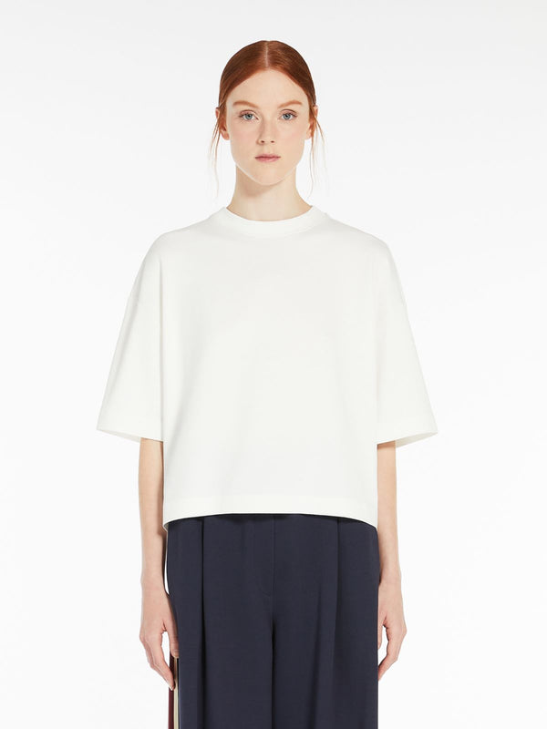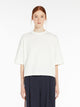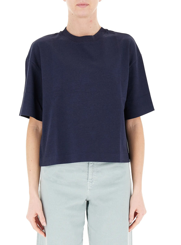 T-shirt boxy in morbido jersey di cotone organico e viscosa. Il modello presenta collo tondo rifinito a costine e maniche corte a giro leggermente basso.