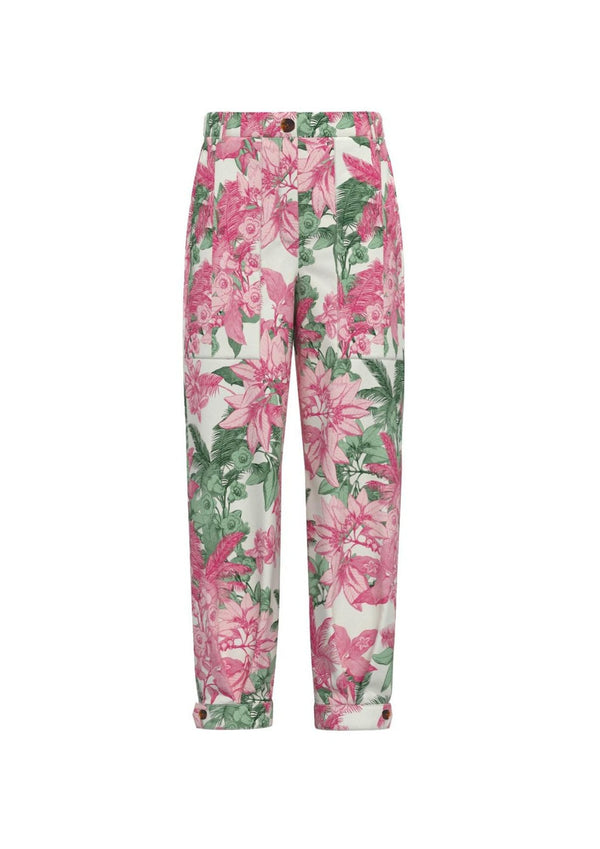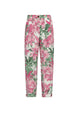 Pantalone in cotone stretch decorato da una macro stampa floreale. Le nuance della primavera illuminano un morbido tessuto, con linee ampie e dettagli ispirati ai modelli work.