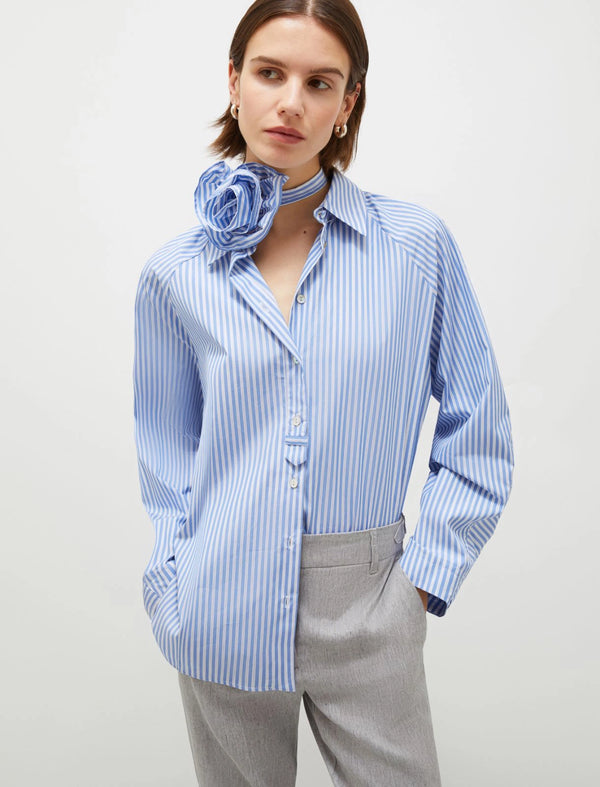 Affronta la nuova stagione con tutta la femminilità di una camicia in popeline. I dettagli che la rendono speciale sono il fiore in tessuto da annodare al collo e il volume over, decisamente contemporaneo.