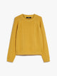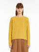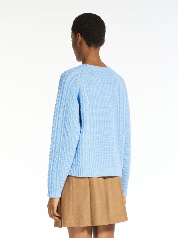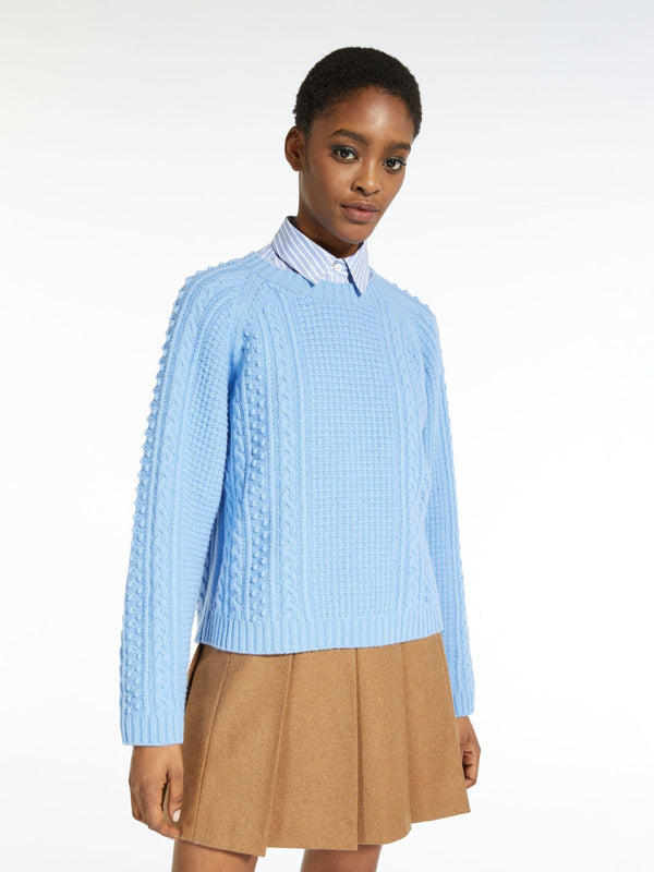 Maglia in filato di pura lana con girocollo, maniche lunghe raglan, bordi a coste. Il mix di lavorazioni dona un carattere inedito alla texture del capo. Lunghezza 58 cm.