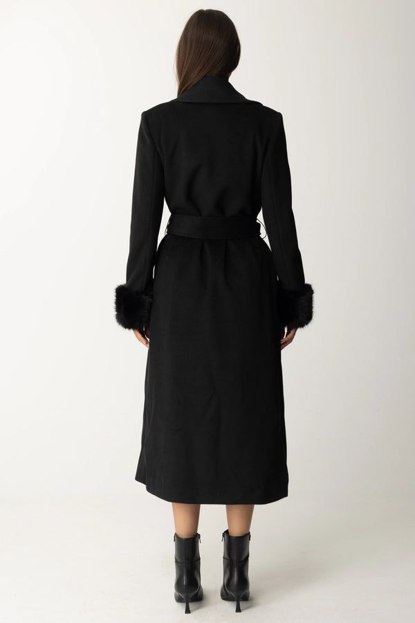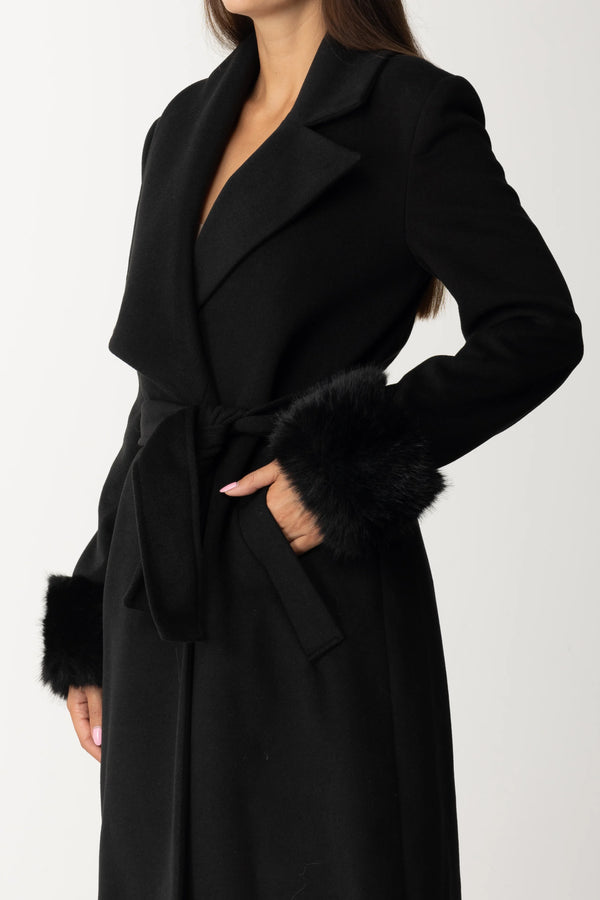 Yes London Cappotto con cintura in vita e polsini in pelliccia Nero