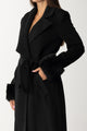 Cappotto nero doppiopetto con chiusura a bottoni a scatto e cintura annodabile in vita. Ha polsini in morbida pelliccia che lo caratterizzano, e lunghezza fino alle caviglie, è un capo di alta moda ideale per affrontare l'inverno con stile e raffinatezza. È perfetto per essere indossato in occasioni speciali o semplicemente per aggiungere un tocco di eleganza alla tua routine quotidiana