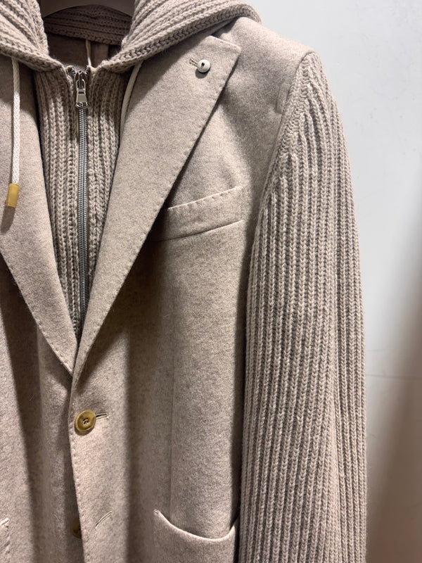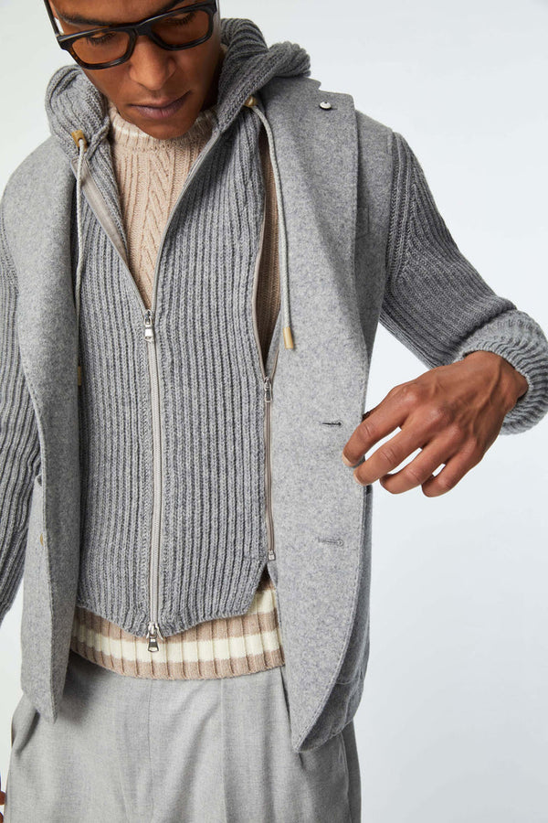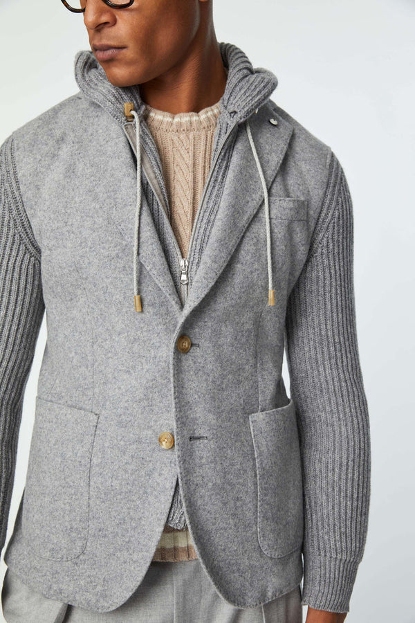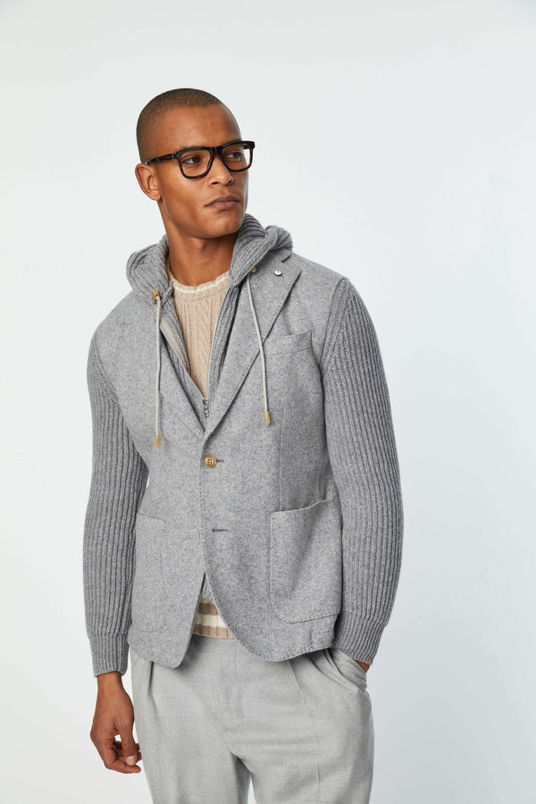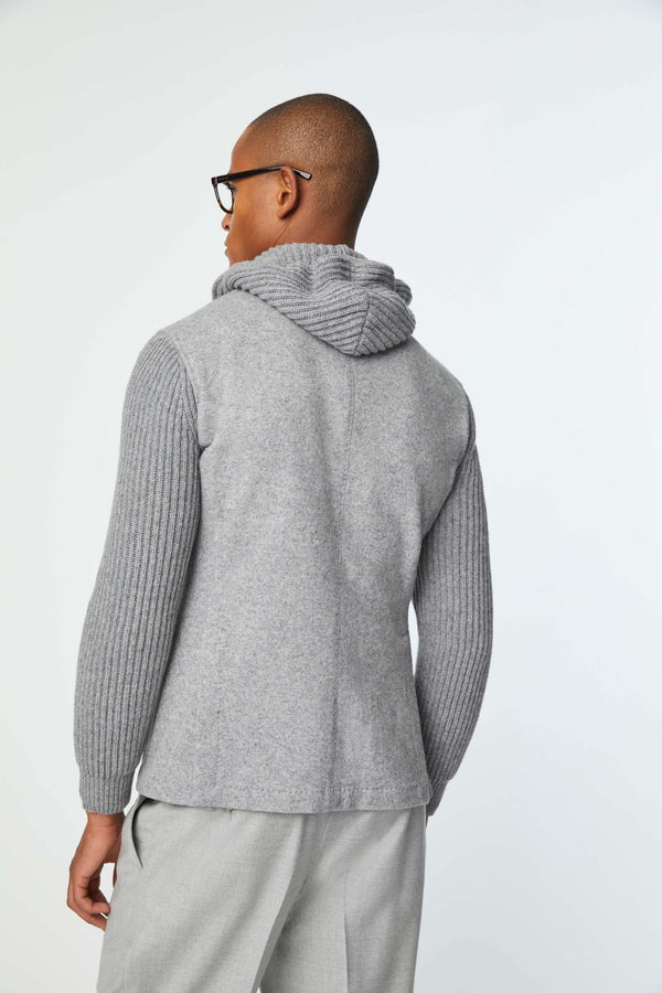 Giacca monopetto da uomo in jersey nel tono del grigio chiaro melange. Dotata di cappuccio removibile in maglia a costa larga, questo capo è pratico e versatile. Le maniche, anch'esse in maglia, donano un tocco di originalità a questo blazer perfetto per la stagione invernale.