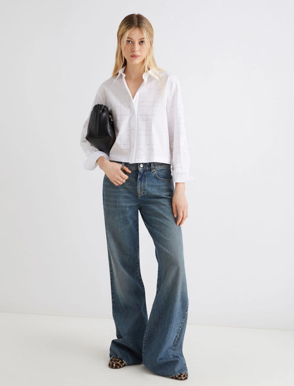 Il minimalismo della camicia in popeline si trasforma in capo trendy, grazie ai cristalli applicati e alla linea boxy sul busto. Da indossare in libertà con denim, pantaloni sartoriali o longuette colorate.
