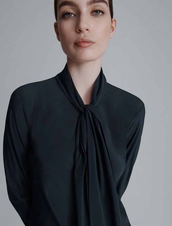 Il morbido fiocco al collo aggiunge una nota romantica a questa camicia in pura seta. Intensa nelle nuance, elegante con pantaloni e maglieria dalle forme attuali.