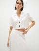 Per chi non rinuncia al tocco trendy del blazer anche in estate, ecco la versione corta in ramié, con un volume di ispirazione eighties che lascia scoperto l'ombelico. Provala sulla longuette on tone, il tuo city look è già pronto.
