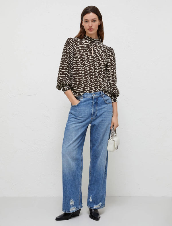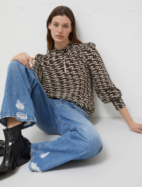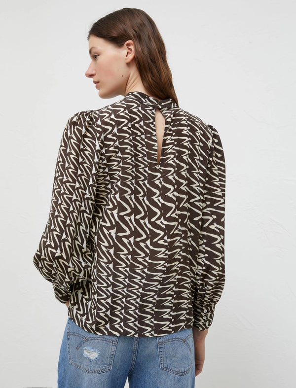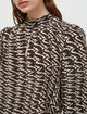 Stampe a regola d'arte per questa blusa in crêpe di seta dal pattern grafico di stagione. Il dettaglio a goccia e delicate arricciature sulle spalle mettono in risalto il tuo lato romantico.