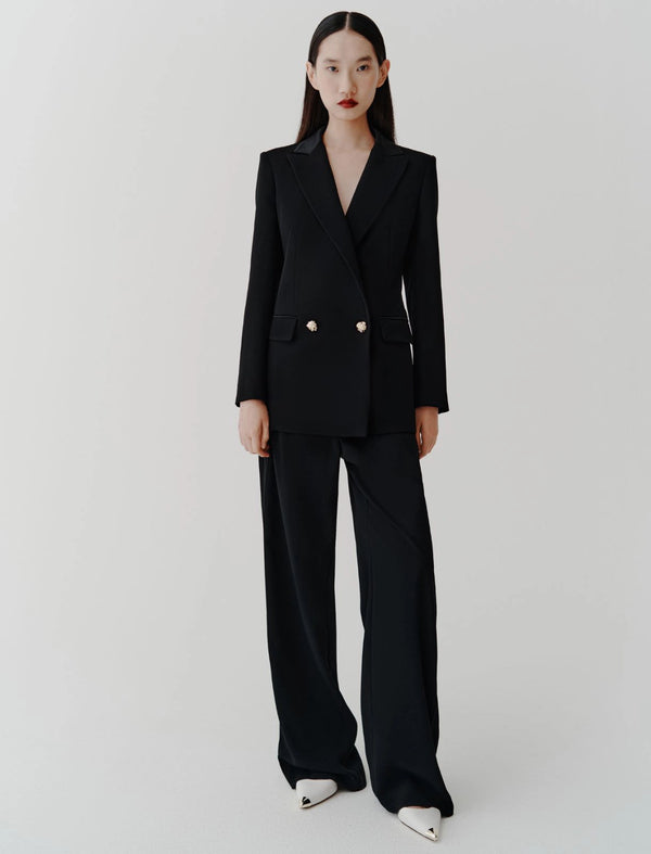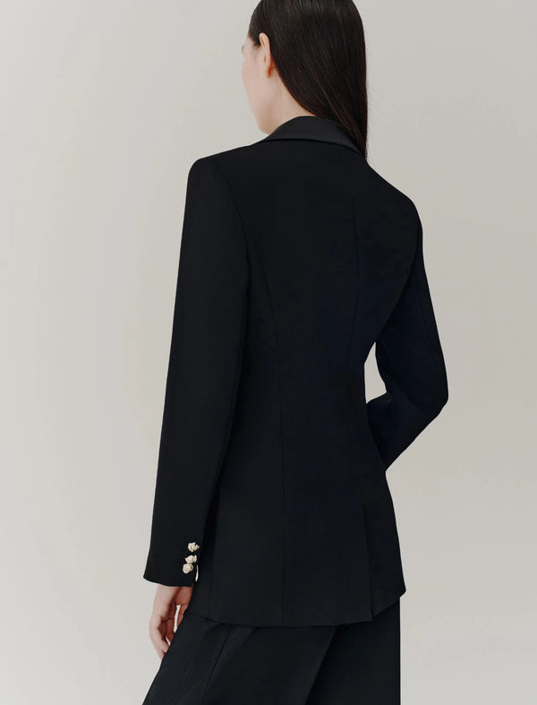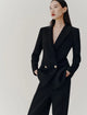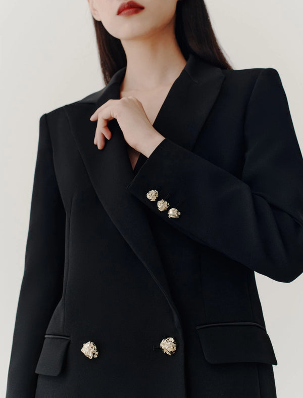 - Chiusura doppiopetto con bottoni dorati, tasche laterali con patta e filetto