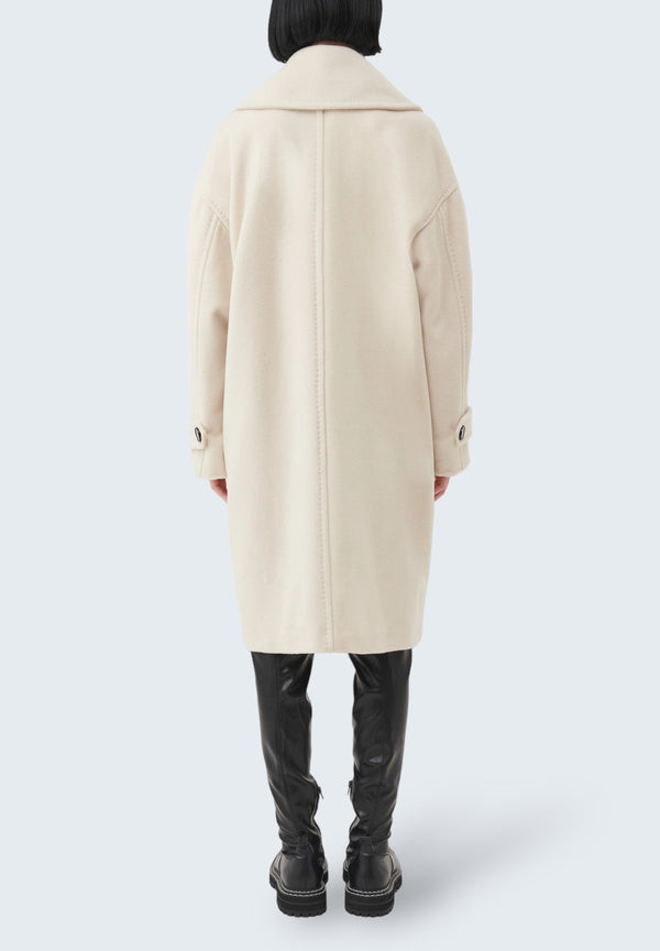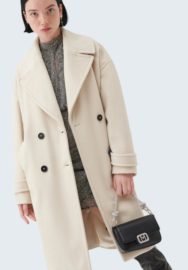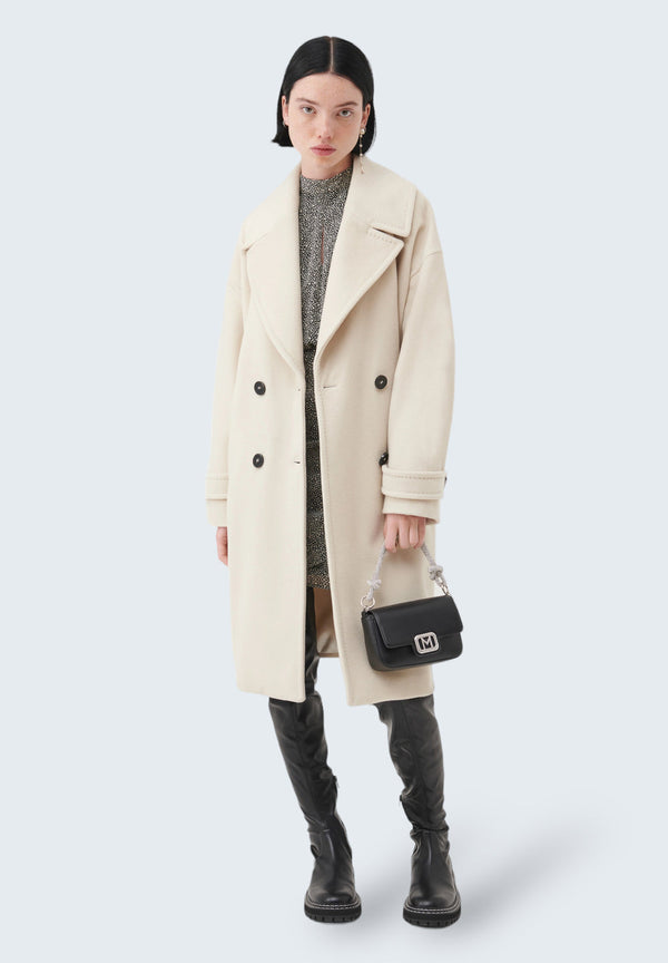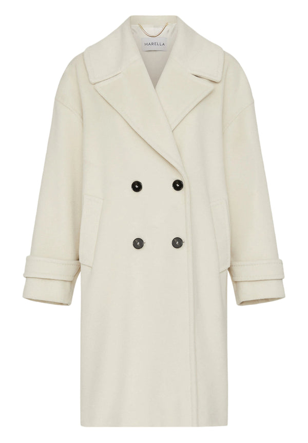 Cappotto in pura lana, linea over. Collo a rever ampio, maniche lunghe con giro sceso e alamaro sul fondo. Chiusura a doppiopetto, tasche a filetto. Foderato.