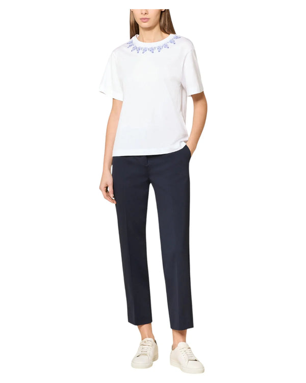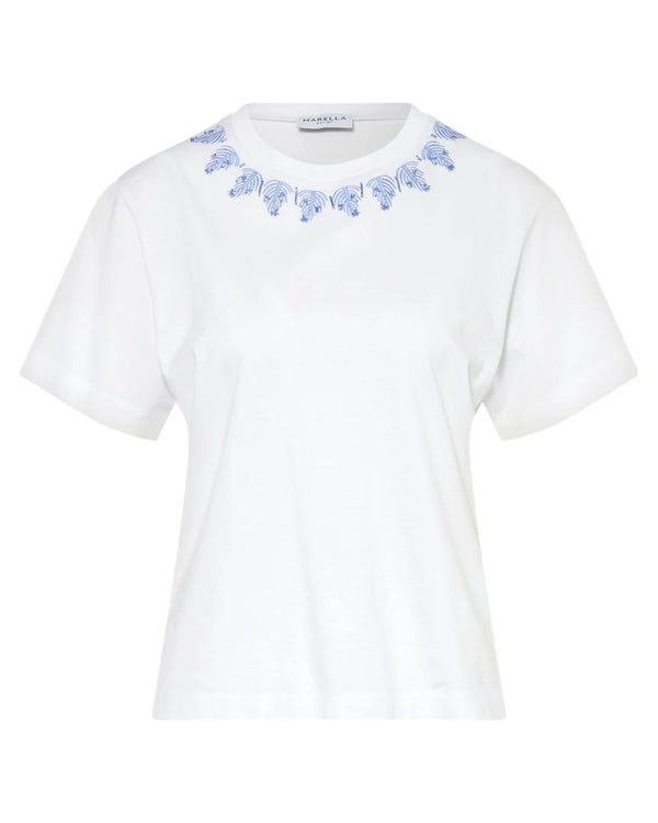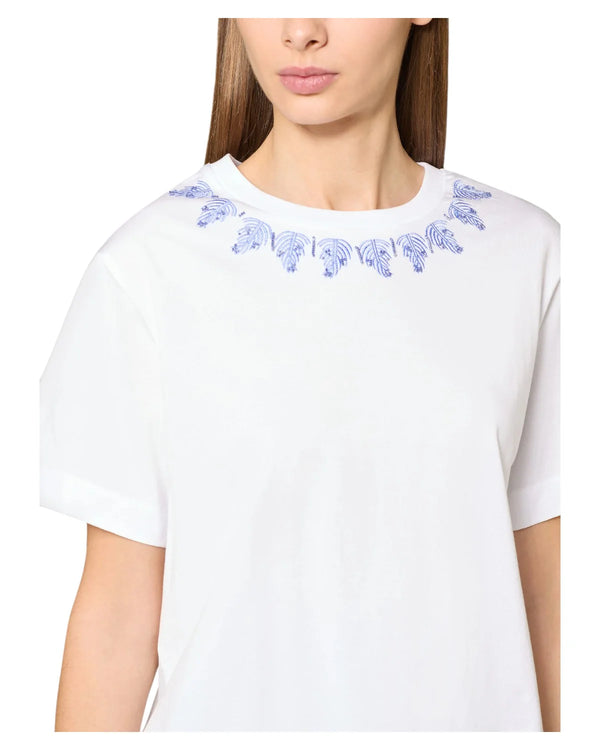 Scopri l'eleganza essenziale della T-shirt MARELLA Feluca, realizzata in morbido jersey di puro cotone per un comfort impareggiabile. Il design dallo stile dritto e il girocollo a coste donano un tocco raffinato e versatile, perfetto per ogni occasione. Le maniche corte e il dettaglio ricamato aggiungono un'eleganza discreta, rendendo questa T-shirt un must-have del guardaroba casual-chic.