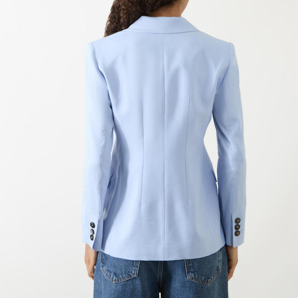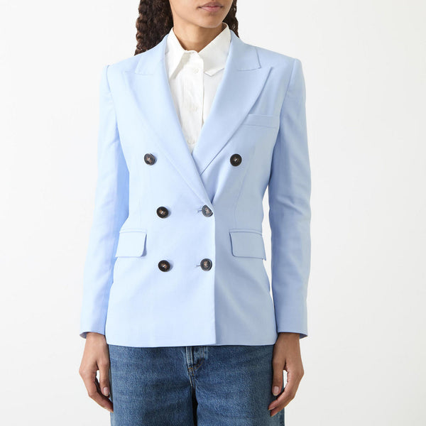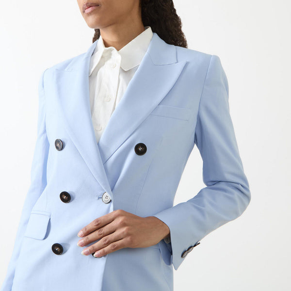 Doppiopetto, chiusura con bottoni, revers a lancia, spalle strutturate, tasche con patta, taschino sul petto, polsini con bottoni