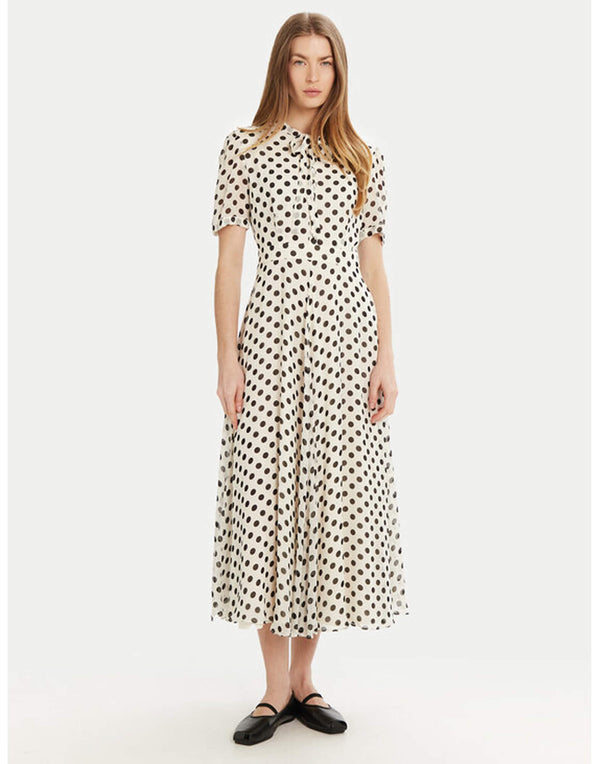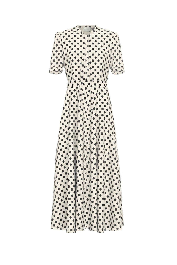 Questo abito Marella Lorenza è un capo dalle linee fit and flare, ideale per slanciare la figura femminile. Realizzato in leggera georgette di viscosa stampata, con fodera interna, presenta un elegante scollo stondato con nastro da annodare e maniche corte. La chiusura con bottoncini ricoperti aggiunge un tocco di raffinatezza, mentre il taglio in vita e la gonna svasata al fondo donano un look femminile e chic.