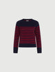 Affronta la nuova stagione con il touch morbido della maglia in lana e cashmere. Il fit dritto e il taglio raglan sulle maniche definiscono un look attuale, mentre la fantasia marinière aggiunge quel tocco timeless che ami tanto.