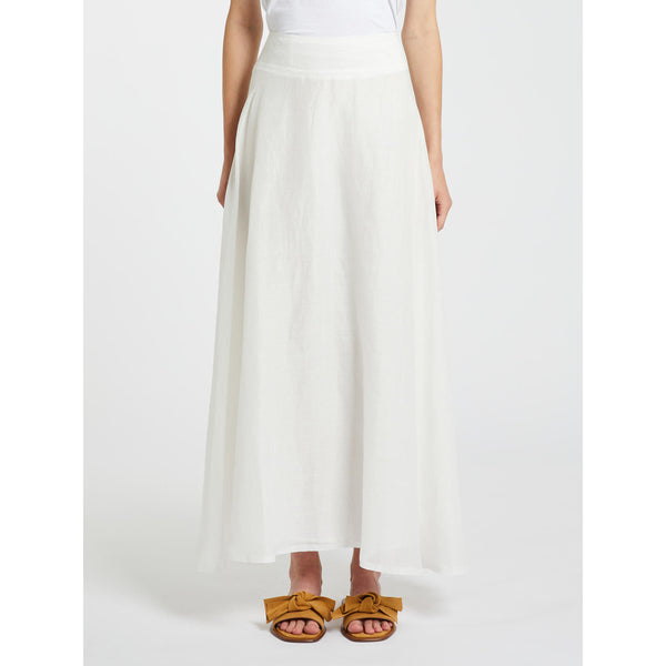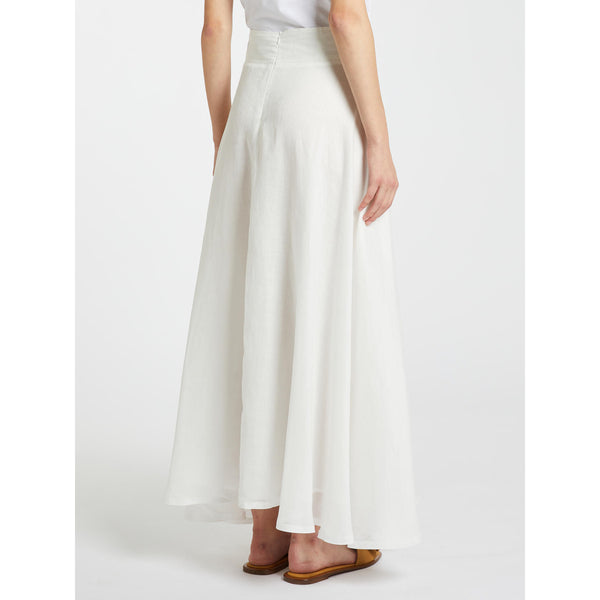 Ampia e fluida, la gonna in ramiè slancia la silhouette con il fascino intramontabile delle sue linee. Impeccabile con un sandalo flat, diventa speciale con un crop top leggero.