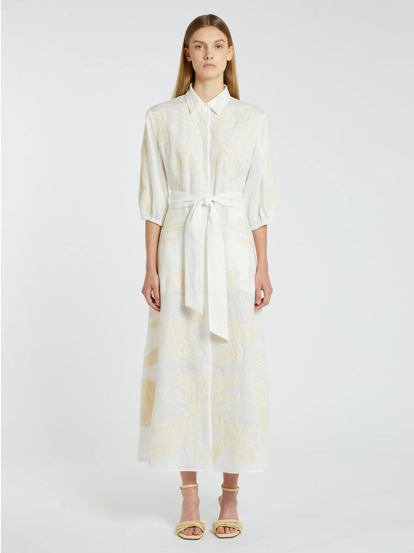 Abito in lino ricamato. Fit leggermente svasato. Collo a camicia. Abbottonatura coperta sul davanti. Maniche lunghe con polsino. Modello sfoderato