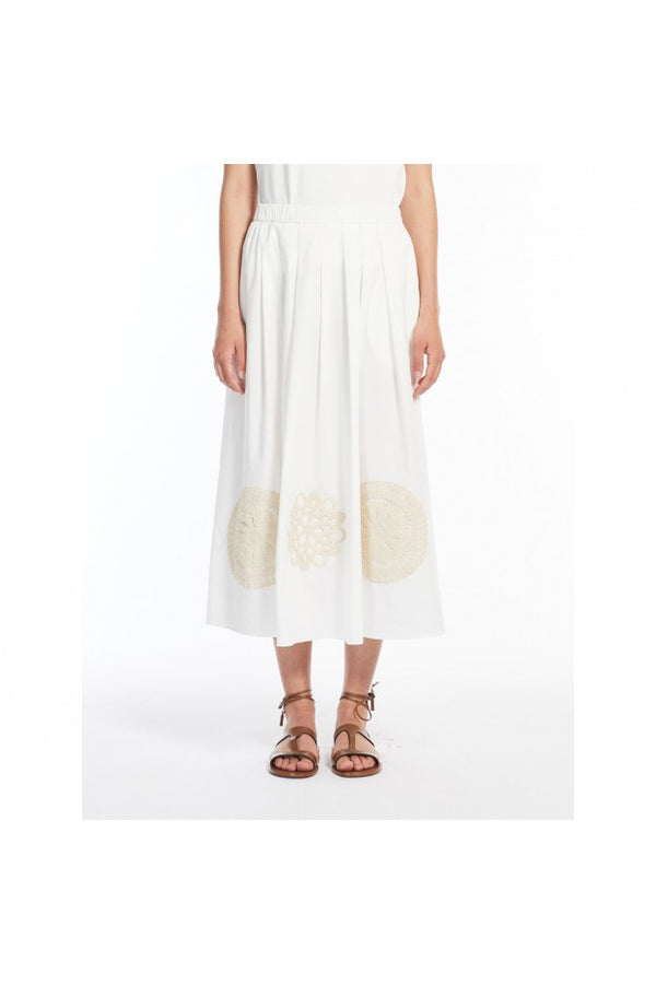 Gonna longuette in tessuto di puro cotone, caratterizzata da una silhouette ampia con motivo a pieghe piatte cucite in vita e dettagli ricamati all over. Modello sfoderato, completato da vita elasticizzata e tasche inserite nei fianchi. Chiusura con zip laterale.