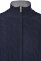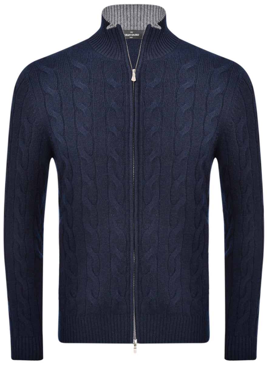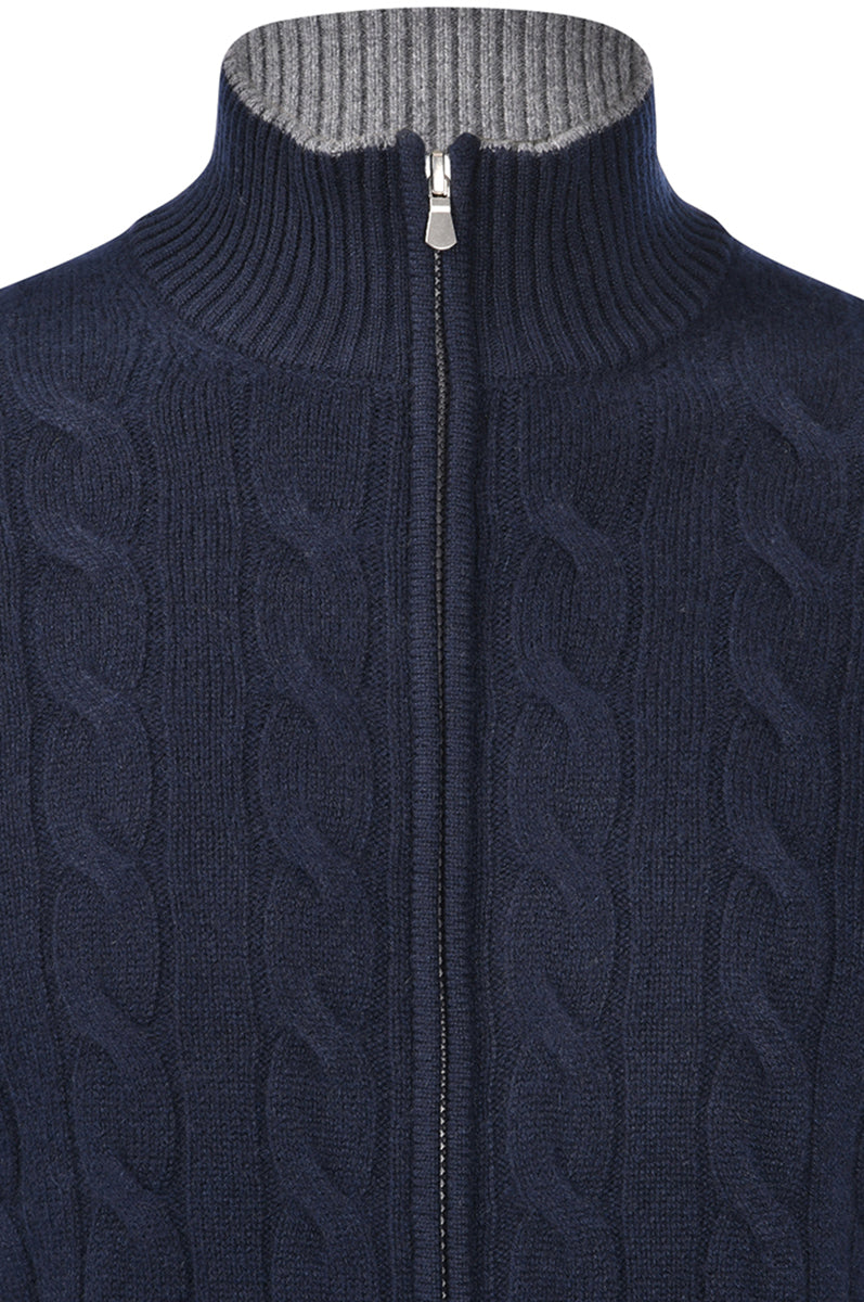 Cardigan collo a lupetto con interno collo, polsi e fondo in contrasto colore. La lavorazione a trecce e coste impreziosisce il capo, mentre la chiusura zip con doppio cursore lo rende comodo e versatile. Un capo caldo e prezioso perfetto per le fredde sere invernali. Prodotto in Italia.
