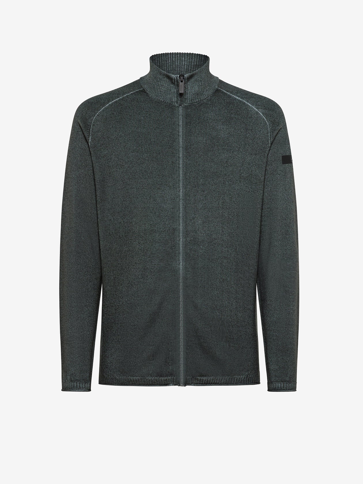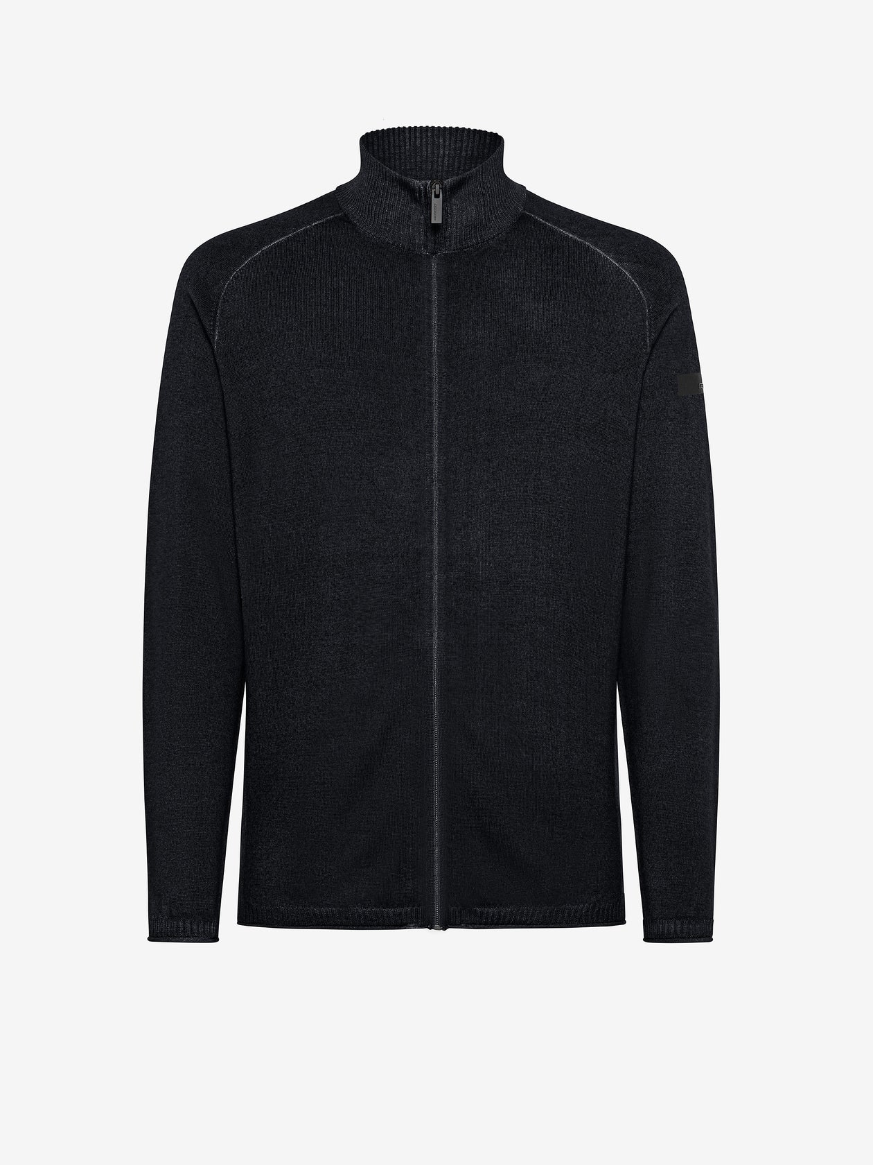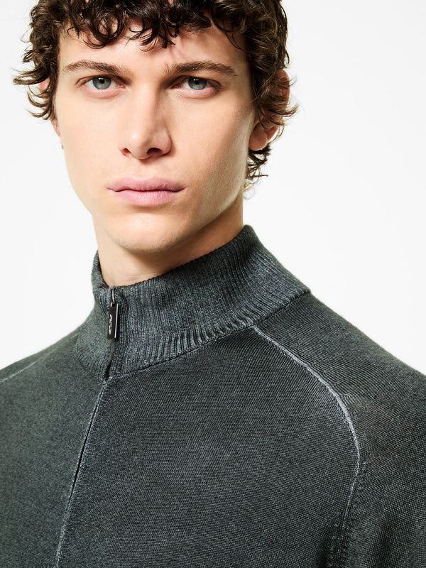 La maglia monocroma a maniche lunghe è realizzata in finissima lana merino elasticizzata, leggera e dal touch particolarmente morbido. Il ricercato effetto delavé e il taglio raglan delle maniche lunghe conferiscono un accento dinamico e originale alla chiusura a zip integrale del davanti e del colletto alto. La finitura a coste inglesi elasticizzate degli inserti sui fianchi, dei polsi e del fondo perfeziona la vestibilità regolare e confortevole con un tocco emblematico. L'inserto arancione fluo sul fondo posteriore e il logo a microiniezione nero sulla manica sinistra sono le note inconfondibili di una creazione che si presta a molteplici look casual per la mezza stagione.