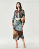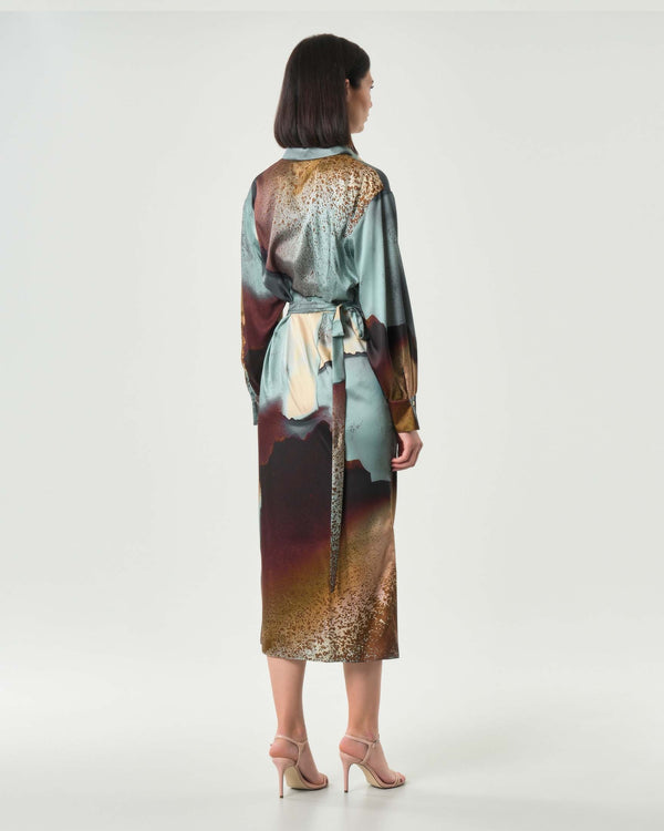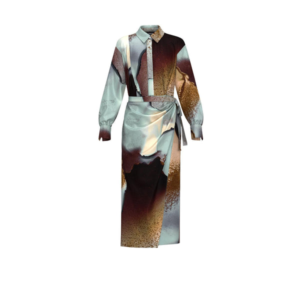 Abito "Meringa" color carta da zucchero in twill tecnico, caratterizzato da una macro stampa astratta nei toni del cielo e della terra. Modello dal fit femminile sfiancato in vita, con collo a camicia e abbottonatura nascosta fino al punto vita, zip laterale e polso alto con bottone e piccolo arriccio. La gonna a portafoglio con fusciacca laterale dona movimento ed eleganza. Realizzato con tessuto contenente oltre il 50% di poliestere riciclato.