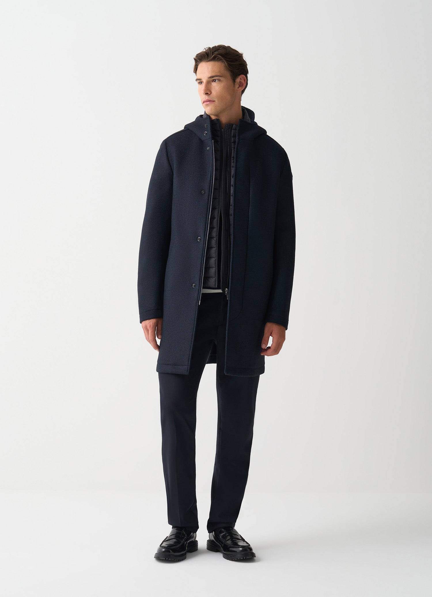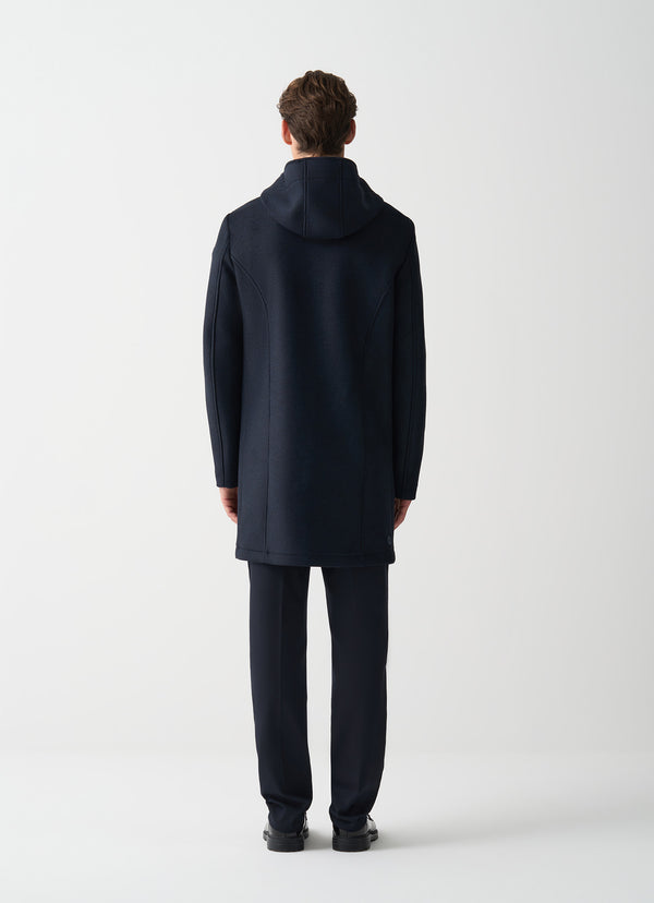 Il cappotto lungo da uomo si rinnova in chiave sportiva con il cappuccio, combinando eleganza e praticità per un look casual, ideale nelle giornate più fresche.