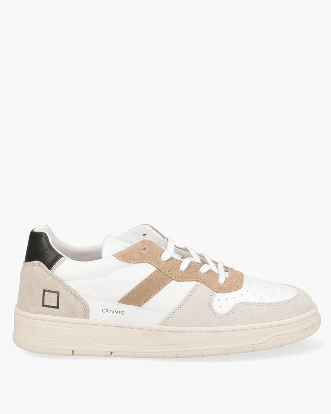Sneaker modello Court 2.0 Vintage Calf , tomaia in pelle bianca con inserti in camoscio cuoio e beige, punta traforata. Lacci piatti in cotone bianco. Suola in gomma bianca. Logo stampato sul lato esterno. Spoiler posteriore in pelle nera. Fodera interna in spugna e pelle e soletta rimovibile.