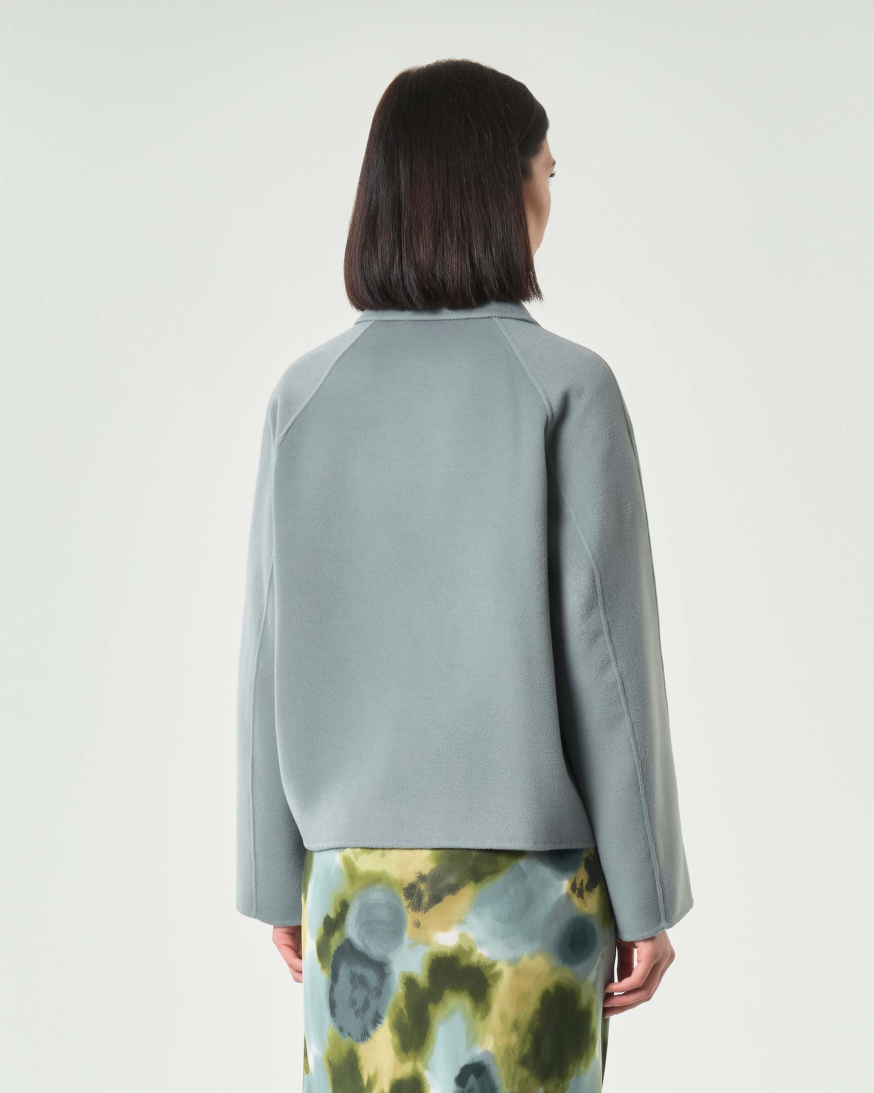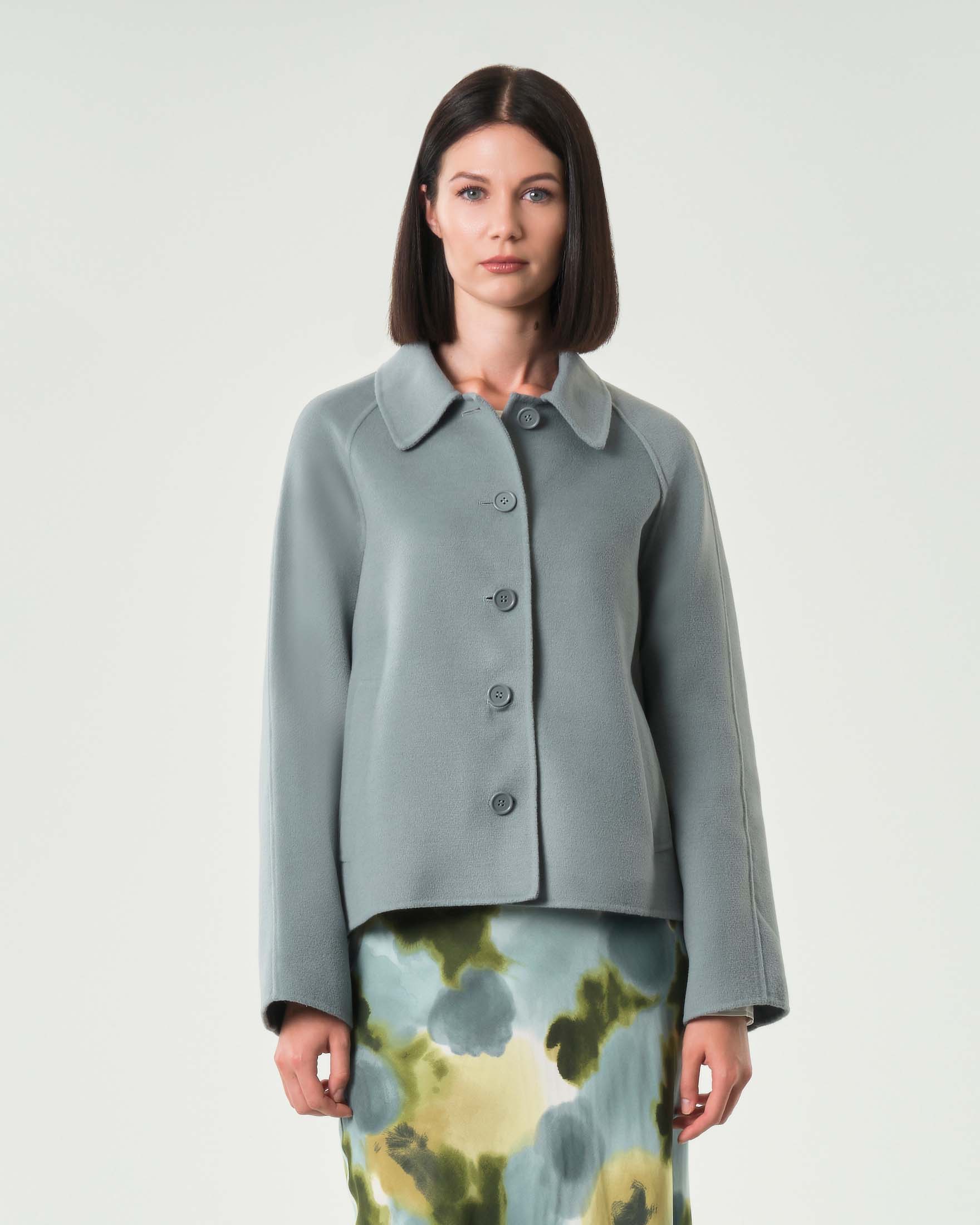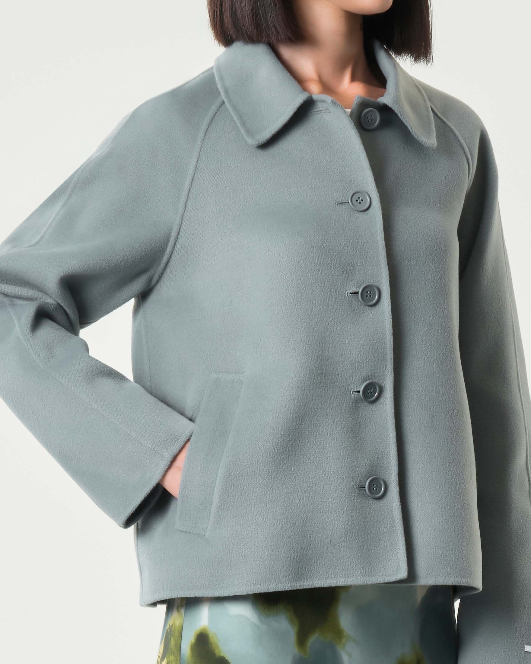 Cappottino in tessuto effetto double di lana con colletto classico e tasche laterali a filetto. Maniche raglan e chiusura a bottoni a vista tono su tono. Cucito a mano. Sfoderato.