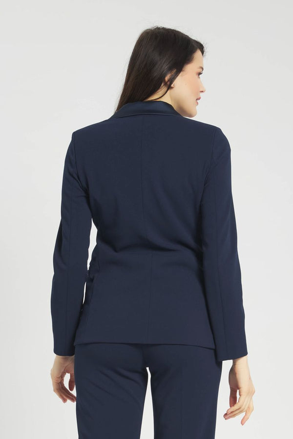 Blazer con colletto a revers in raso. Maniche lunghe e tasche con patta con dettaglio in raso frontali. Chiusura frontale a doppiopetto con bottoni.