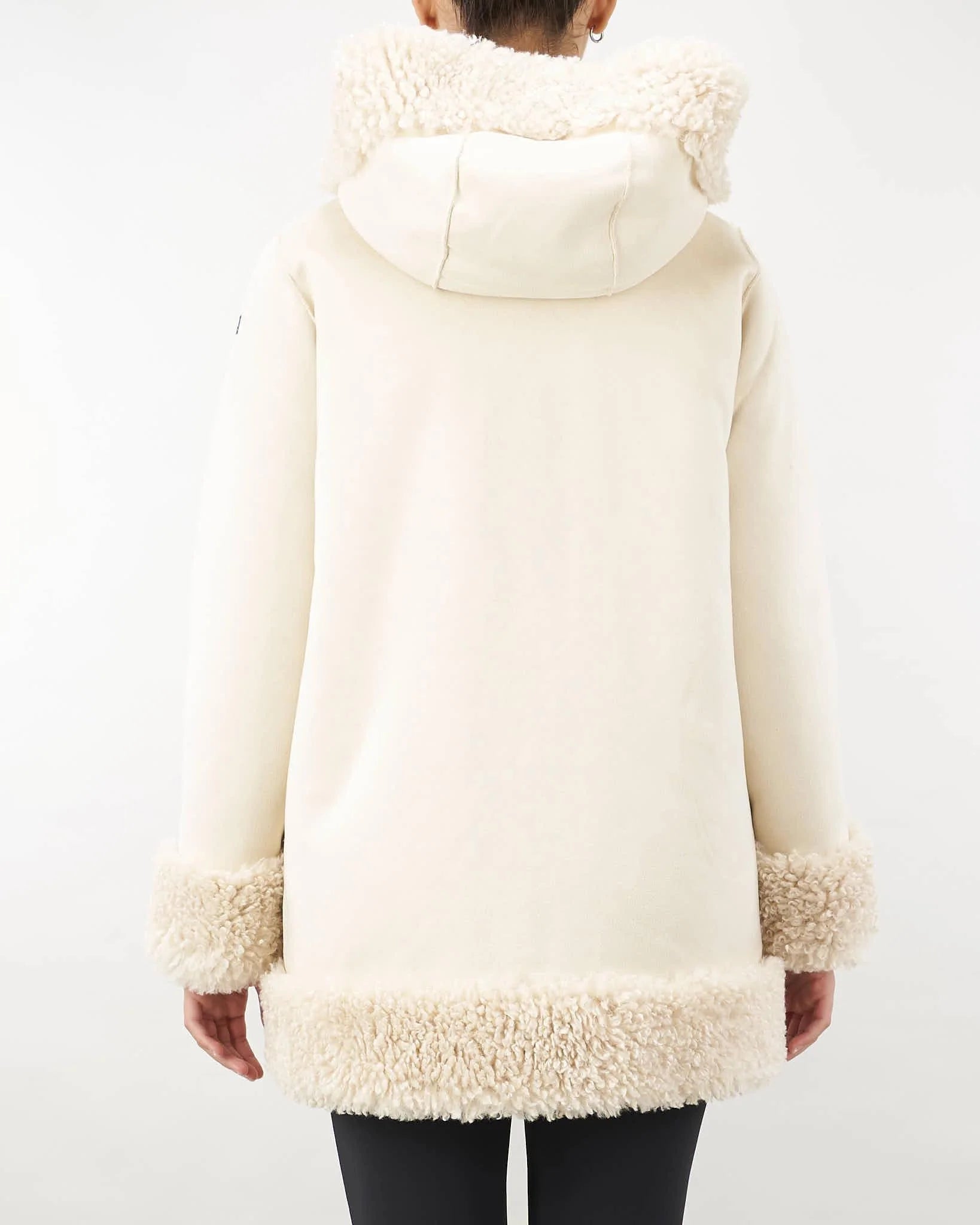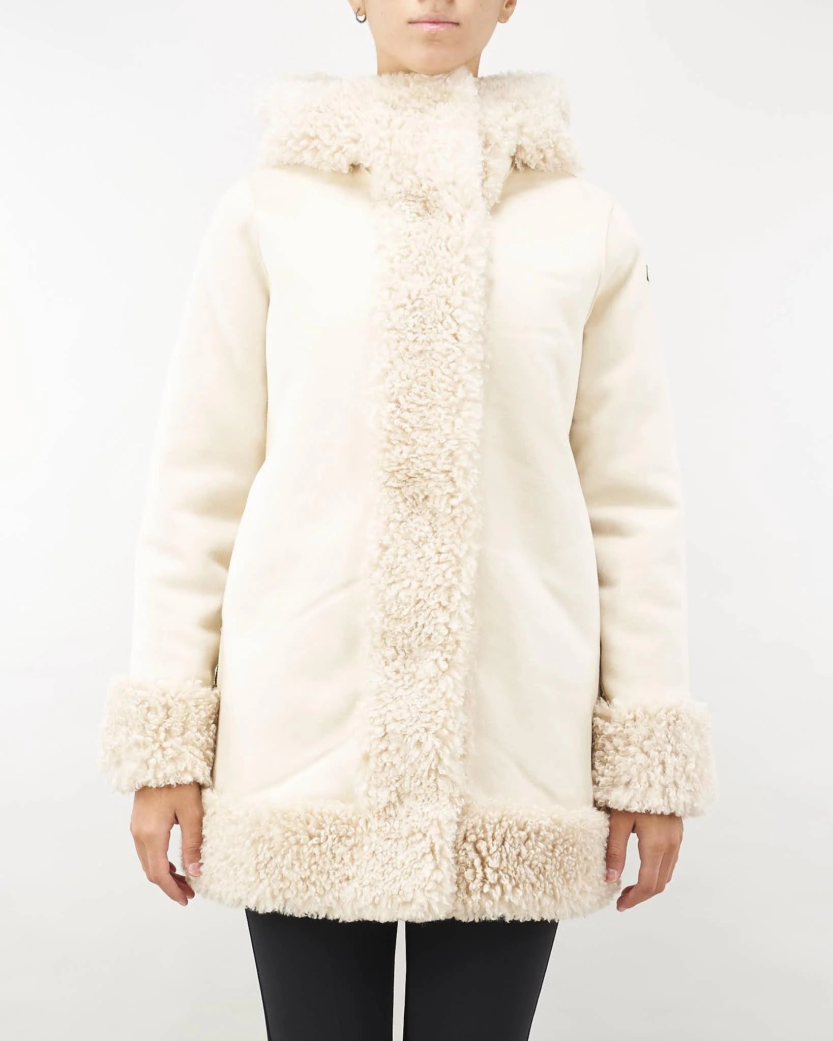 Il capospalla versatile e di grande carattere si distingue per la silhouette e la costruzione originale del davanti e delle maniche, impreziositi dalla eco pelliccia teddy calda e avvolgente. Il retro presenta i canali tubici che contengono l’imbottitura in morbida e calda piuma d’anatra, dal grande comfort e leggerezza. Il cappuccio, ampio e scenografico, combina le due texture avvolgendo il viso e conferendo al design un’allure unica e sofisticata. La lunghezza ai fianchi, le tasche invisibili e la chiusura a zip con doppio cursore nascosta dalla pattina sono le note distintive che esaltano il carattere minimalista e la funzionalità. Perfetto per uno stile sporty chic, Lamb Hybrid Hood Wom Jkt si dimostra perfetto nell’affrontare con eleganza le giornate più fredde dell’inverno.