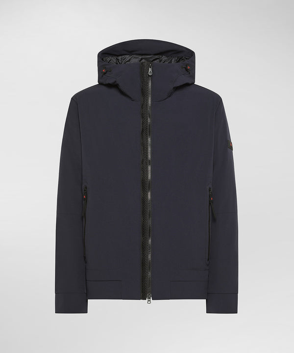 Giacca corta realizzata in tela di poliestere stretch accoppiata con un jersey di poliestere soffice e caldo, grazie alla finezza dei filati utilizzati. L’imbottitura in Thermoplume, valida alternativa sintetica alla piuma d’oca, assicura calore, morbidezza e leggerezza, oltre a una naturale resistenza all’acqua. Parte della linea Color in cui i disegni geometrici prendono vita ed esaltano i piumini della sezione, un concept giocoso e ironico che reinterpreta il capospalla in modo creativo ed easy. Il design essenziale e curato include doppia zip centrale pensata per regolare il capo e aggiungere praticità, tasche laterali a filetto, polsini antivento in maglina nera e cappuccio con tiranti regolabili, per una protezione ottimale. Il trattamento idrorepellente PFC Free Free – privo di sostanze chimiche dannose per l’ambiente - rende il capo ideale per affrontare ogni situazione quotidiana, dal tempo libero agli spostamenti urbani, con stile e funzionalità.