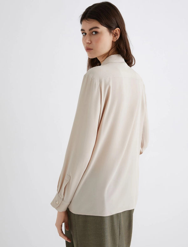 L'eleganza fluida del crêpe de Chine trasforma questa camicia in un pezzo sempre sofisticato. Personalizza il tuo styling con il fiore in tessuto, si annoda con un gesto semplice al collo o in vita.