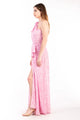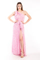 Abito lungo senza maniche dalla linea fluida in leggero chiffon con stampa maculata dal particolare effetto acquerellato. Scollo monospalla con dettaglio annodato, riproposto anche sulla gonna dove si apre un ampio spacco. La zip invisibile laterale aiuta e facilita l'indosso.