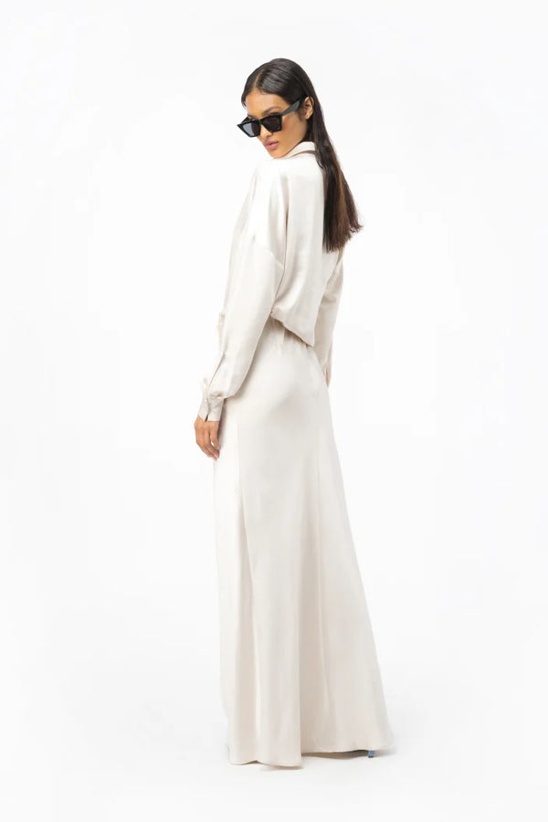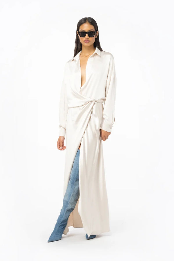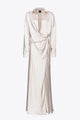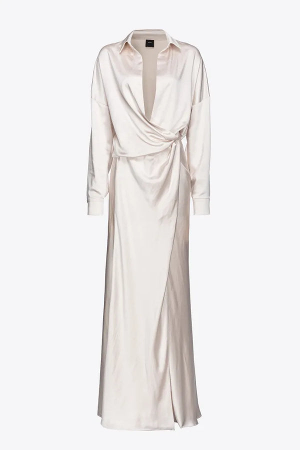 Abito lungo chemisier elegante in raso lucido martellato, trattamento che conferisce al tessuto un particolare effetto tridimensionale. Top dal volume morbido, raccolto in vita, con colletto a camicia, profondo scollo a V incrociato e drappeggiato davianti, maniche lunghe a giro basso con polsino al fondo. Gonna lunga dalla linea sgivalata, con incrocio a portafoglio davanti che crea uno spacco femminile.