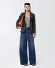 Jeans dalla silhouette baggy in denim comfort lavaggio vintage medio scuro "storm blue". Vita bassa con cavallo comodo e gamba dalla linea ampia con tasche workwear applicate sia davanti che sul retro, fondo capo tagliato al vivo, con un leggero effetto sfrangiato. Chiusura con zip e bottone a chiodo in metallo.