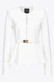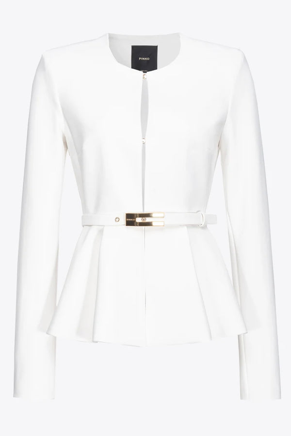 Giacca dal design elegante in tessuto crêpe tecnico stretch. Linea aderente, svasata al fondo, con scollo tondo, maniche lunghe e cintura sottile abbinata nello stesso tessuto impreziosita da fibbia metallica con logo PINKO. Foderata. Chiusura con piccoli gancetti nascosti.