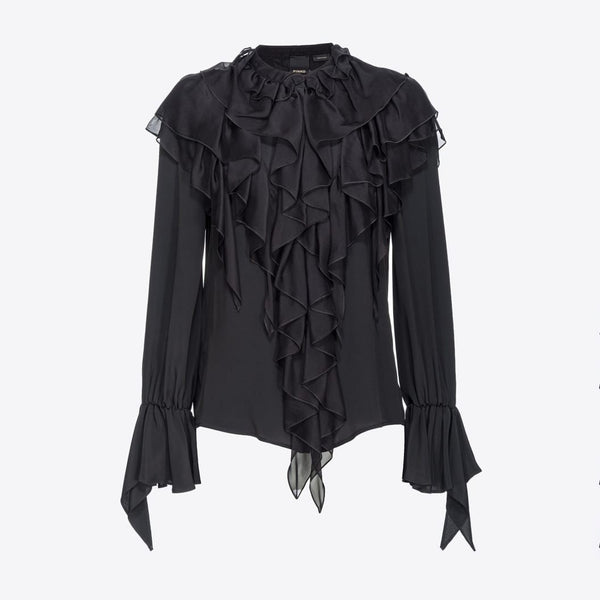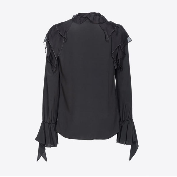 Camicia femminile in crêpe de Chine di misto seta. La parte superiore del capo è impreziosita da una cascata di volant in chiffon di seta in tinta. Piccolo collo alla coreana con bottone e maniche lunghe con polsini a balza elasticizzati.