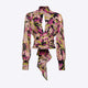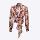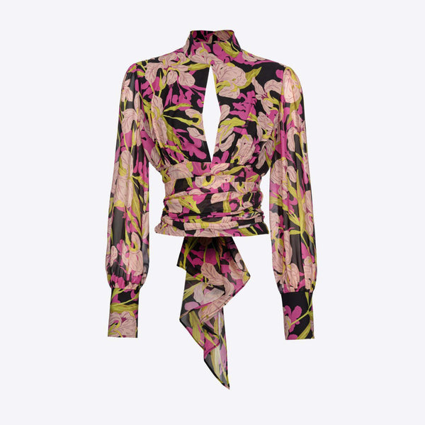 Blusa corta e femminile in leggera georgette con stampa di fiori di iris all over. Colletto alla coreana con bottoncino al centro dietro e cut-out verticale sullo scollo davanti e dietro. Maniche lunghe e leggermente ampie con polsino e fusciacca lunga in tessuto coordinato da annodare in vita. Chiusura centrale con zip nascosta sul retro.