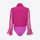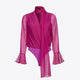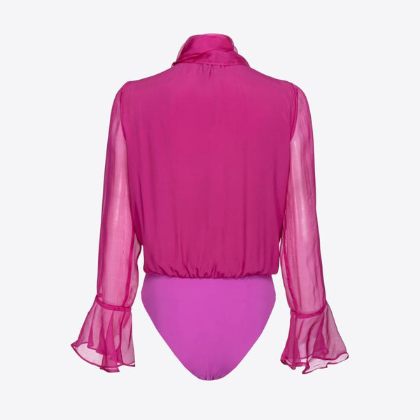 Body drappeggiato in leggero chiffon di seta con fodera in crêpe de Chine di misto seta in tono colore, che lascia le maniche in trasparenza. Scollo a V incrociato davianti, completato da fusciacca da annodare al collo, e maniche lunghe con dettagli di arricci sulle spalle e polsino svasato al fondo. Chiusura con bottoni.