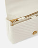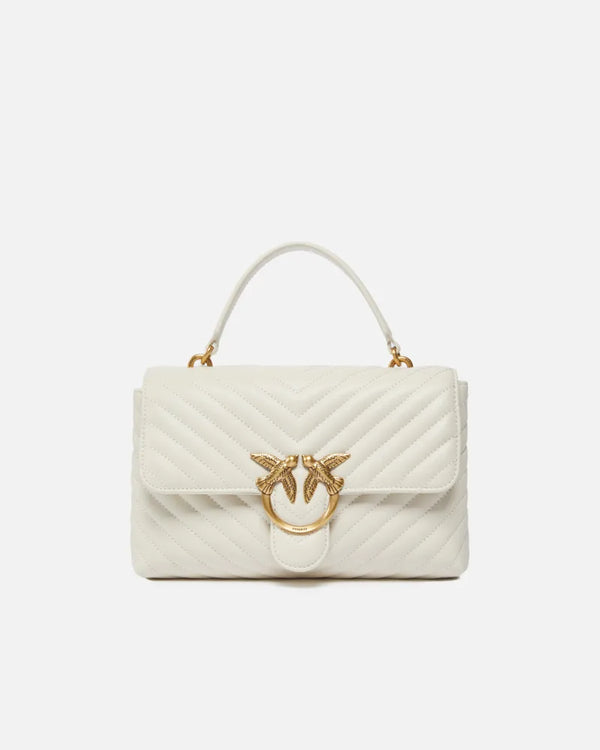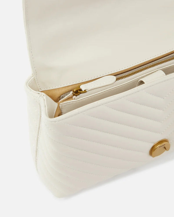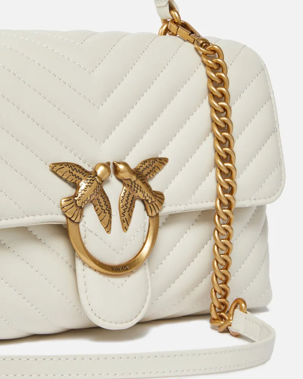 Classic Love Bag Puff in nappa trapuntata con motivo chevron. La chiusura è completata dall'iconica fibbia in metallo Love Birds Diamond Cut. L'interno è foderato in microfibra scamosciata e comprende tramezza chiusa con zip e tasca a parete. La tracolla combina la classica catena metallica rotonda al pratico spallaccio regolabile in nappa.