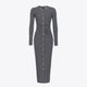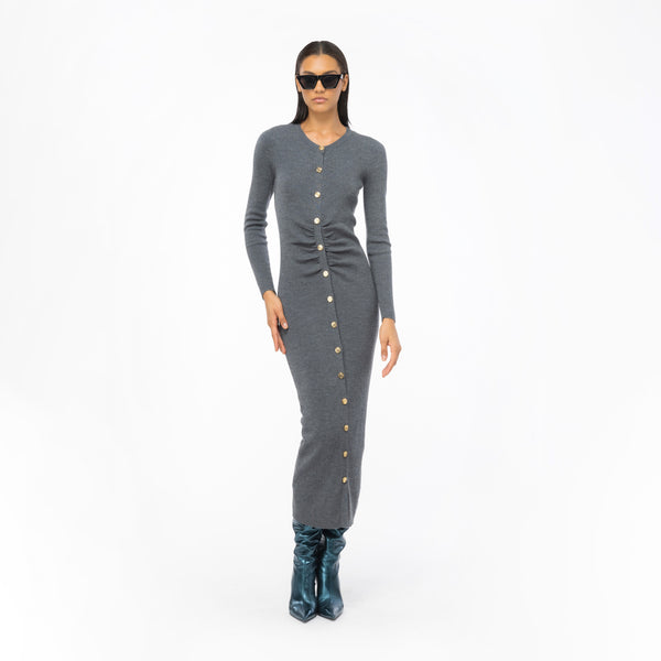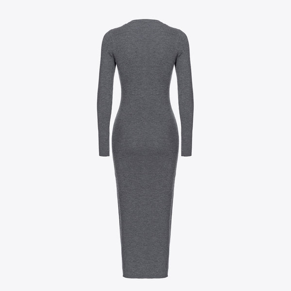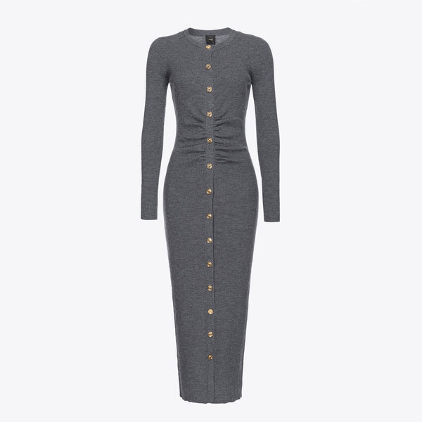 Abito lungo dalla linea aderente in maglia di misto lana stretch lavorata a costine. Scollo tondo, maniche lunghe e chiusura con bottoni in metallo davianti, su tutta la lunghezza.