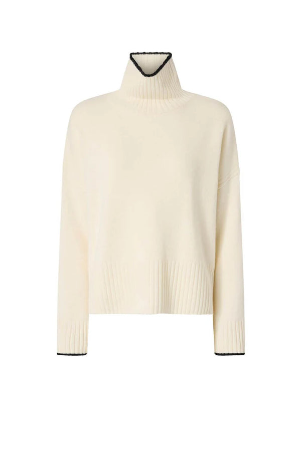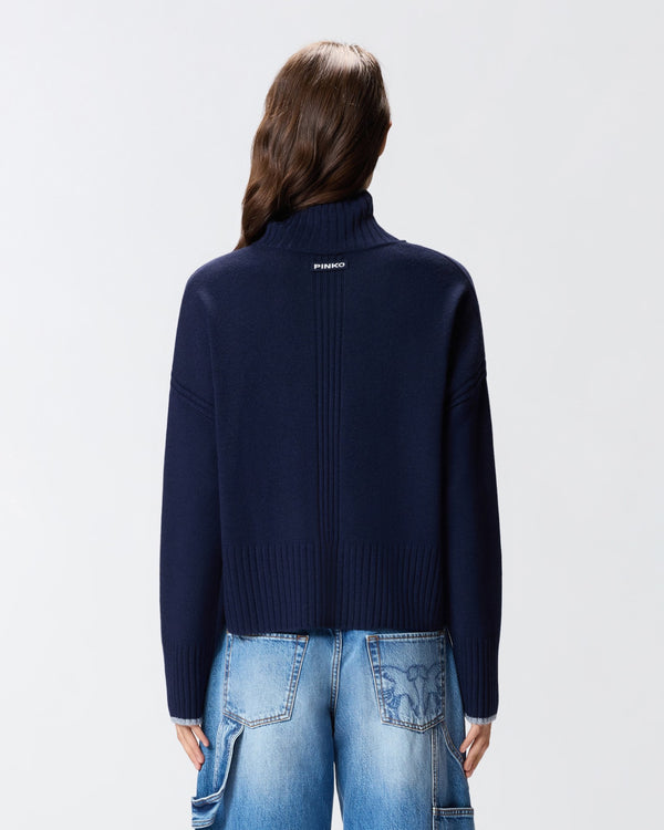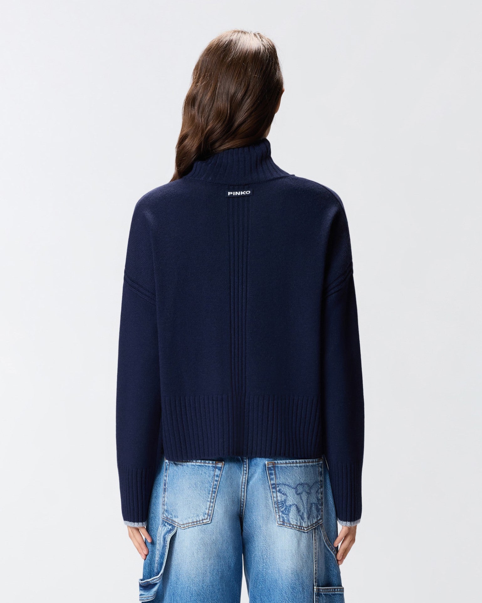 Dolcevita a maniche lunghe in misto lana merino e cashmere, ideale per scaldare i tuoi outfit della stagione fredda. Essenziale e contemporaneo, questo design diventerà il protagonista indiscusso di tutti i tuoi outfit, qualunque sia l'occasione. Il filato a contrasto su scollo e polsini dona un tocco di vivacità al design. Scollo, orlo e polsini sono lavorati a coste, mentre il tocco finale è dato dall'etichetta con logo lettering PINKO sul retro. Il capo è stato sottoposto a prove di finissaggio per ridurre al minimo la possibile formazione di pilling, garantendo una maggiore morbidezza e durabilità del tessuto.